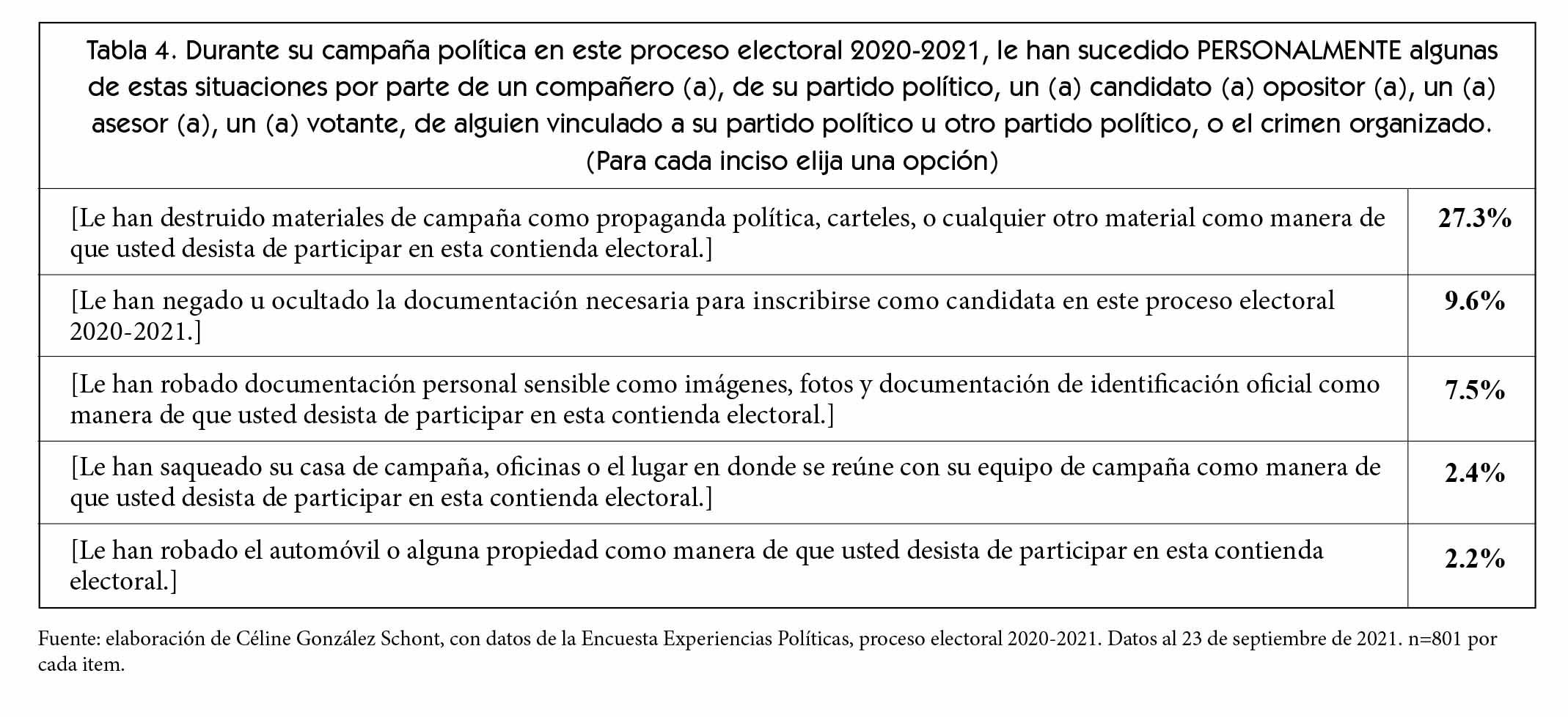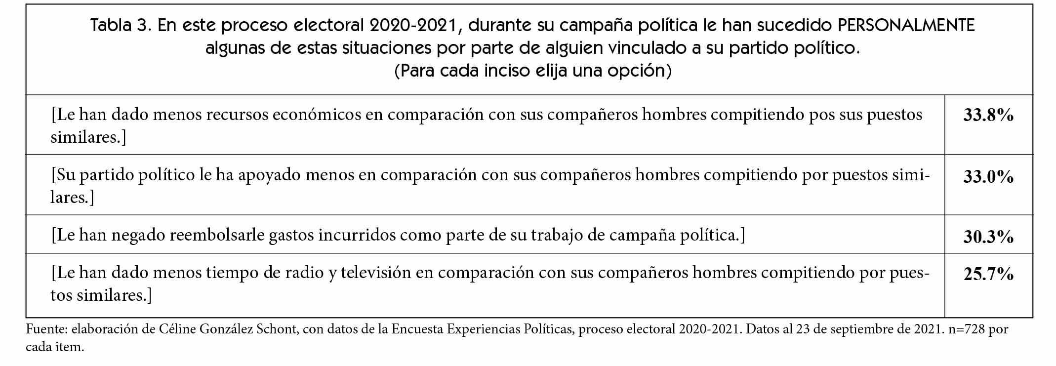 Este apartado solo fue contestado por aquellas candidatas que representaban a un partido político durante el proceso electoral 2020-2021, puesto que se intentaba recolectar datos sobre el comportamiento de partidos políticos al asignar recursos. Como se puede observar en la Tabla 3, el 33.8% de las candidatas perciben haber recibido menos recursos económicos en comparación con sus compañeros hombres compitiendo por puestos similares. Llama la atención que el 25.7% de las mujeres percibieron haber recibido menos tiempo de radio y televisión en comparación con sus compañeros hombres, a pesar de los esfuerzos del Instituto Nacional Electoral y de los Organismos Públicos Locales Electorales (OPLE) por asignar igualitariamente espacios de radio y televisión.