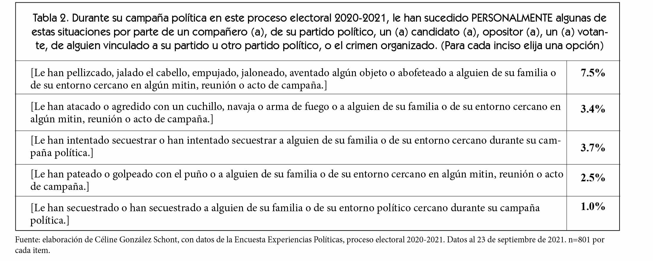 Con respecto a la violencia física, se puede observar que es la violencia que menos sufren las mujeres que contestaron la encuesta. Como se observa en la Tabla 2, solo el 7.5% de las mujeres mencionaron haber sido pellizcadas, empujadas, jaloneadas, entre otras vejaciones en algún mitin, reunión o acto de campaña. Asimismo, el 1% mencionó haber sido secuestrada o que hubieran secuestrado a alguien de su familia.