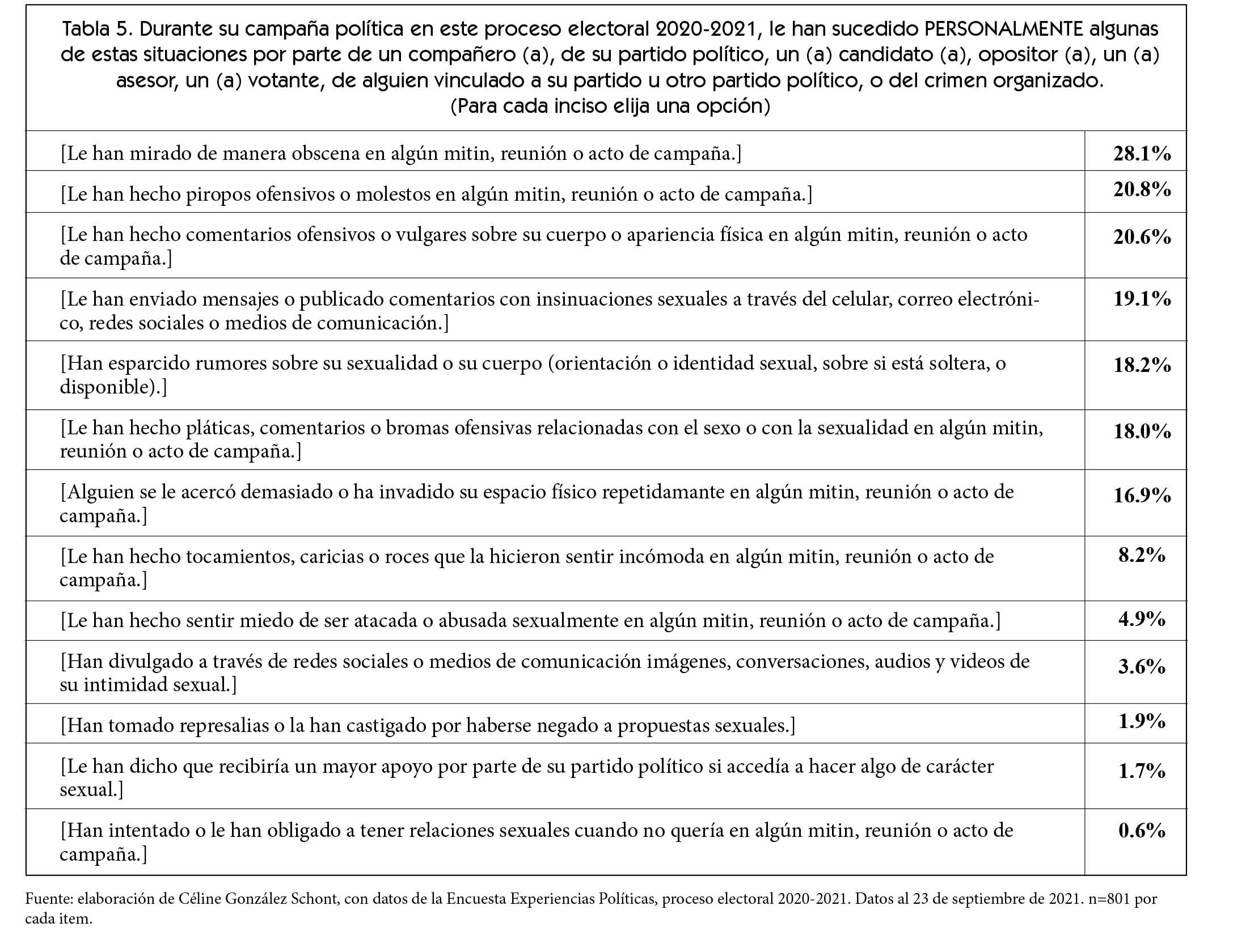 Con respecto a la violencia sexual, como se observa en la Tabla 5, el 28.1% mencionaron haber recibido miradas obscenas y al 20.8% le hicieron piropos ofensivos y molestos en mítines, reuniones o actos de campañas. Un aspecto que resalta y que es de suma gravedad, aunque sea un porcentaje muy pequeño, es que el 0.6% de las candidatas mencionaron que intentaron o las obligaron a tener relaciones sexuales cuando no querían en algún mitin, reunión o acto de campaña de este proceso electoral 2020-2021.
