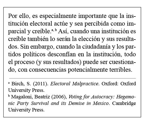 Eso es lo único que necesitas en una elección: confianza. Hay elecciones que, a pesar de experimentar problemas técnicos, son aceptadas por la ciudadanía porque se confía en la institución y en el proceso. El caso sudafricano es emblemático.4 Sin embargo, también puede haber elecciones técnicamente perfectas que terminan en rechazo y protestas por la falta de credibilidad en la institución y en el proceso. Esto se debe a que las elecciones no sólo tienen que ver con procesos y leyes. Se trata de intensos procesos de disputa por el poder político con mucho en juego. El éxito de las elecciones no sólo se compone por tinta indeleble, papeletas seguras y un listado nominal actualizado, sino de percepciones y creencias.5