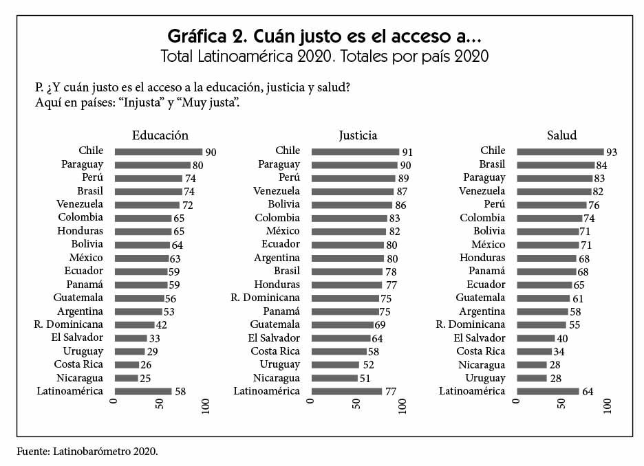¿Cómo se relaciona este factor con la democracia y las instituciones? Más del 70% de personas en Latinoamérica creen que se gobierna para las personas poderosas. Esto está relacionado, a su vez, con una percepción de que el acceso a los bienes y servicios que más le importan a la población, como la salud, la educación y la justicia, no se dan de manera justa. México se ubica por encima de la media latinoamericana en la percepción de injusticia en el acceso a salud y justicia. Así lo muestran las Gráficas 1 y 2.