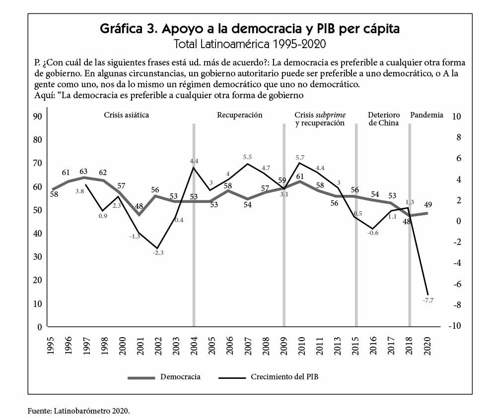 En este contexto, solo cuatro países han registrado su récord histórico de apoyo a la democracia en la última década: Chile, Ecuador, Paraguay y Venezuela. Contrario a lo que muchas veces se sostiene, no es el PIB per cápita el factor que más influye en el apoyo a la democracia y sus fluctuaciones, como se muestra en la Gráfica 3.