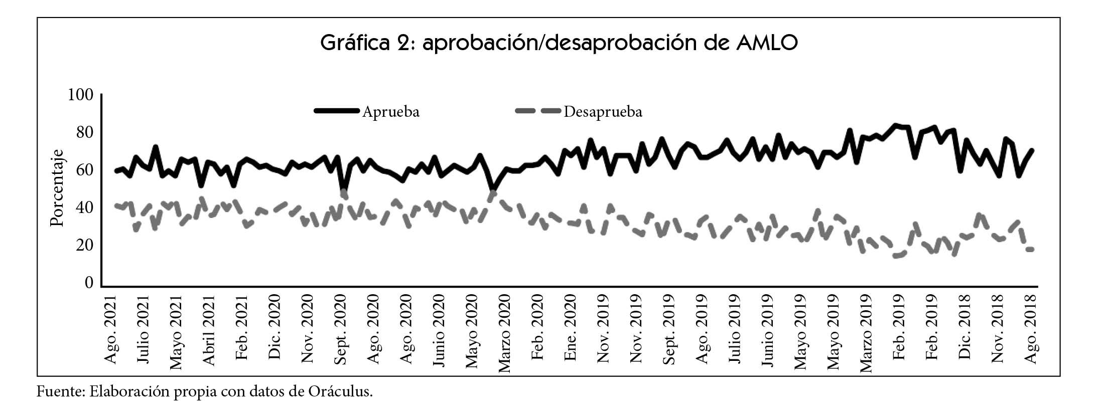 El otro dato –aunque cualitativo– es aún más contundente. Es el relativo a su estilo personal de gobernar. En forma de L’État, c’est moi, el presidente ha demostrado que su presencia absoluta en cada espacio lo mantiene presente en el imaginario de la gente. Ávalos Tenorio (2018) categorizaba al gobierno de AMLO como bonapartismo, aduciendo que es un fenómeno político episódico o transicional consistente en que un poder neutral personificado en un líder carismático tiende a elevarse por encima de las clases en conflicto para pretender representar los intereses del pueblo, desvinculándose de las clases sociales o sectores políticos distintos. Sin embargo, la capacidad o incapacidad de restaurar el orden social del presidente López Obrador no ha sido del todo efectiva, y ha reducido la brecha entre aprobación/desaprobación de su gobierno (Ver gráfica 2).