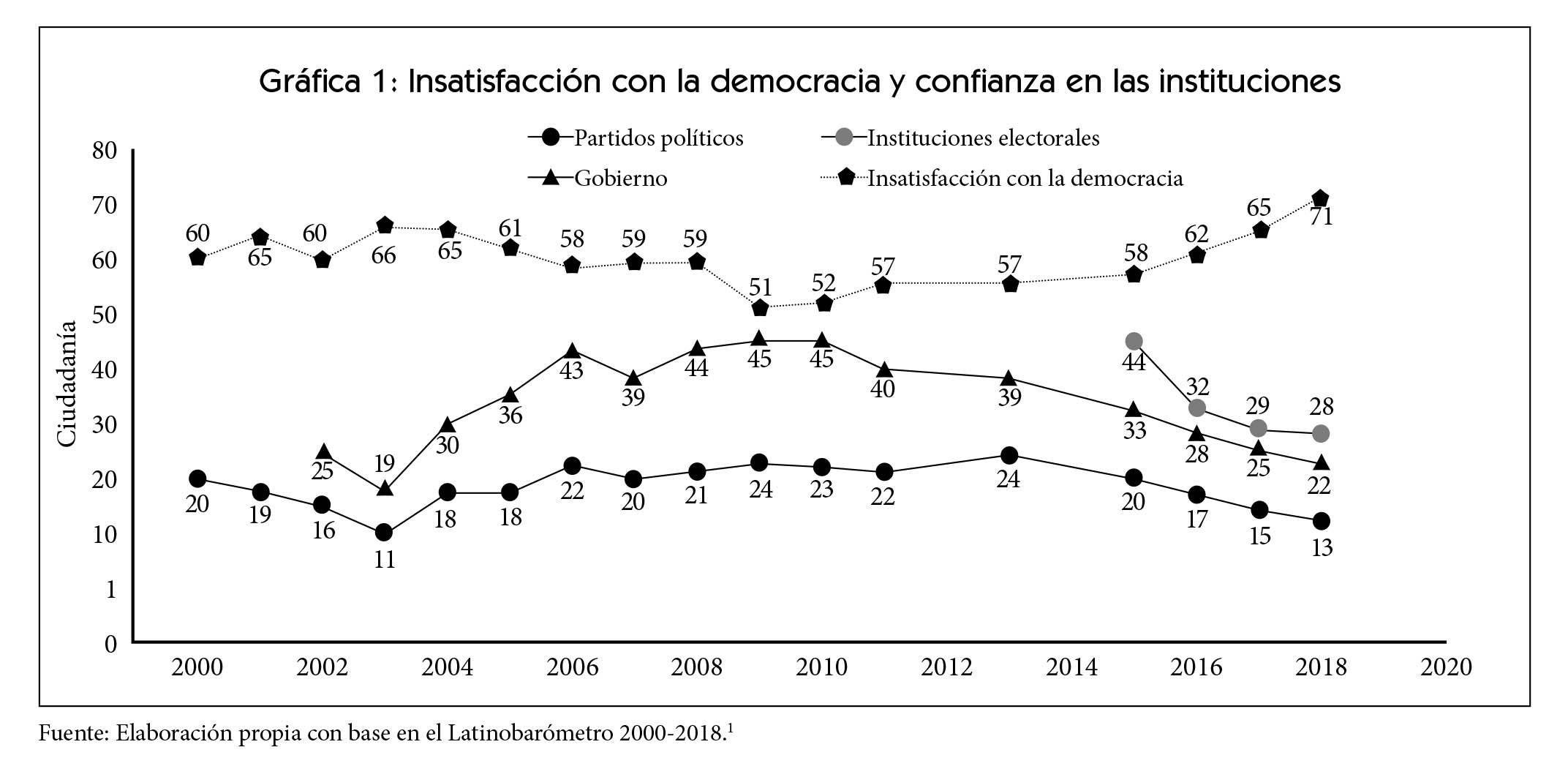 Para el primer caso, resulta relevante prever un par de consideraciones: la ciudadanía en México se encuentra cada vez más consciente de que la legislación y la normatividad son la cristalización del acuerdo entre los partidos políticos, mismos que han ido perdiendo credibilidad y confianza frente a una ciudadanía cada vez más escéptica. De acuerdo con el Latinobarómetro (2000-2018), partidos políticos y gobierno tienen una confianza que no rebasa el 25%, mientras que la autoridad electoral perdió dieciséis puntos porcentuales en solo cuatro años, cayendo al 28% de la confianza en México. Lo que sí ha ido creciendo es la insatisfacción con la democracia tradicional: siete de cada diez personas se encuentran en esa categoría. Esos datos respaldarían la primera acepción de revocación de mandato: asunción de la decisión ciudadana y reforzamiento de la democracia tradicional (Ver gráfica 1).