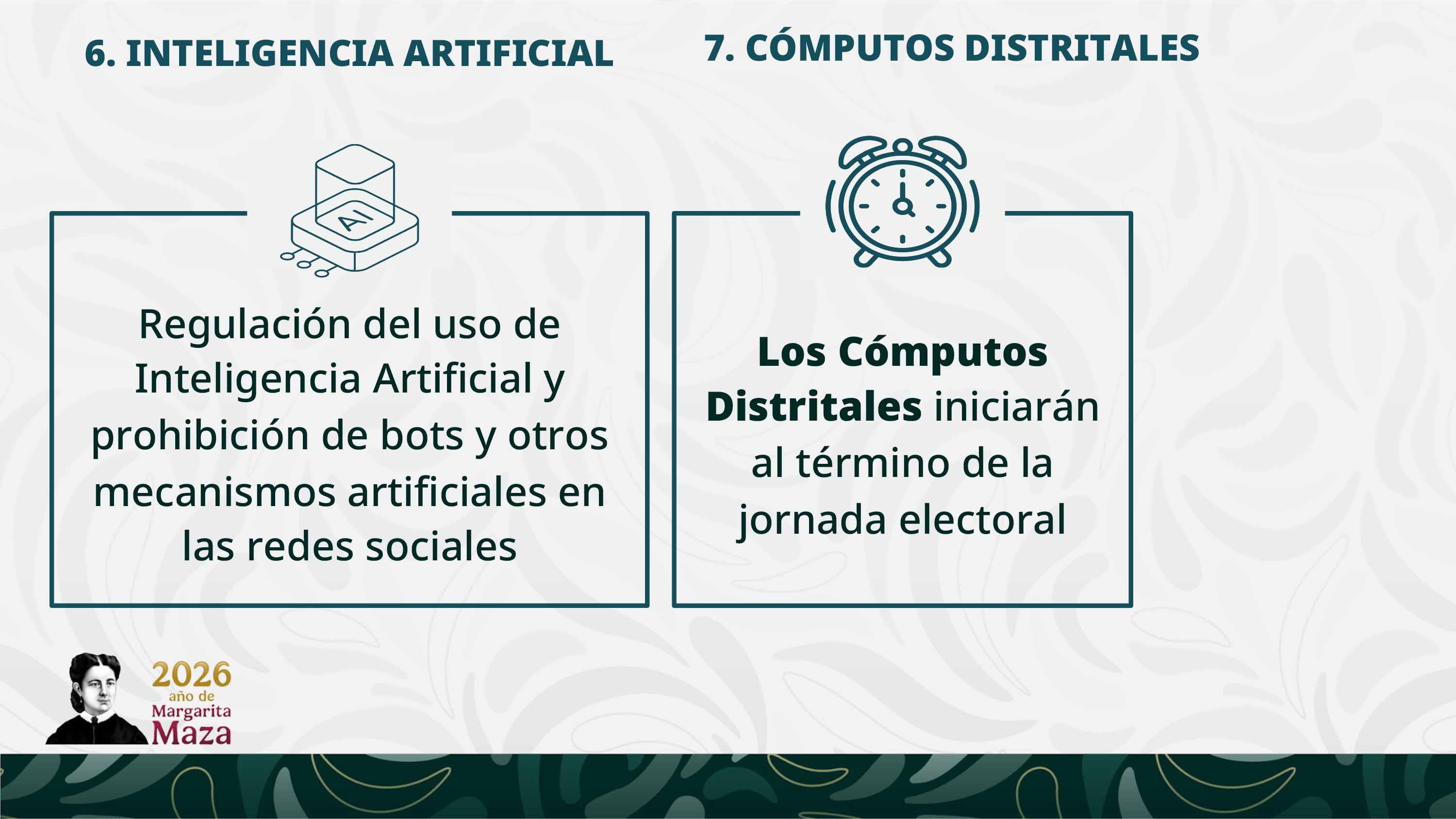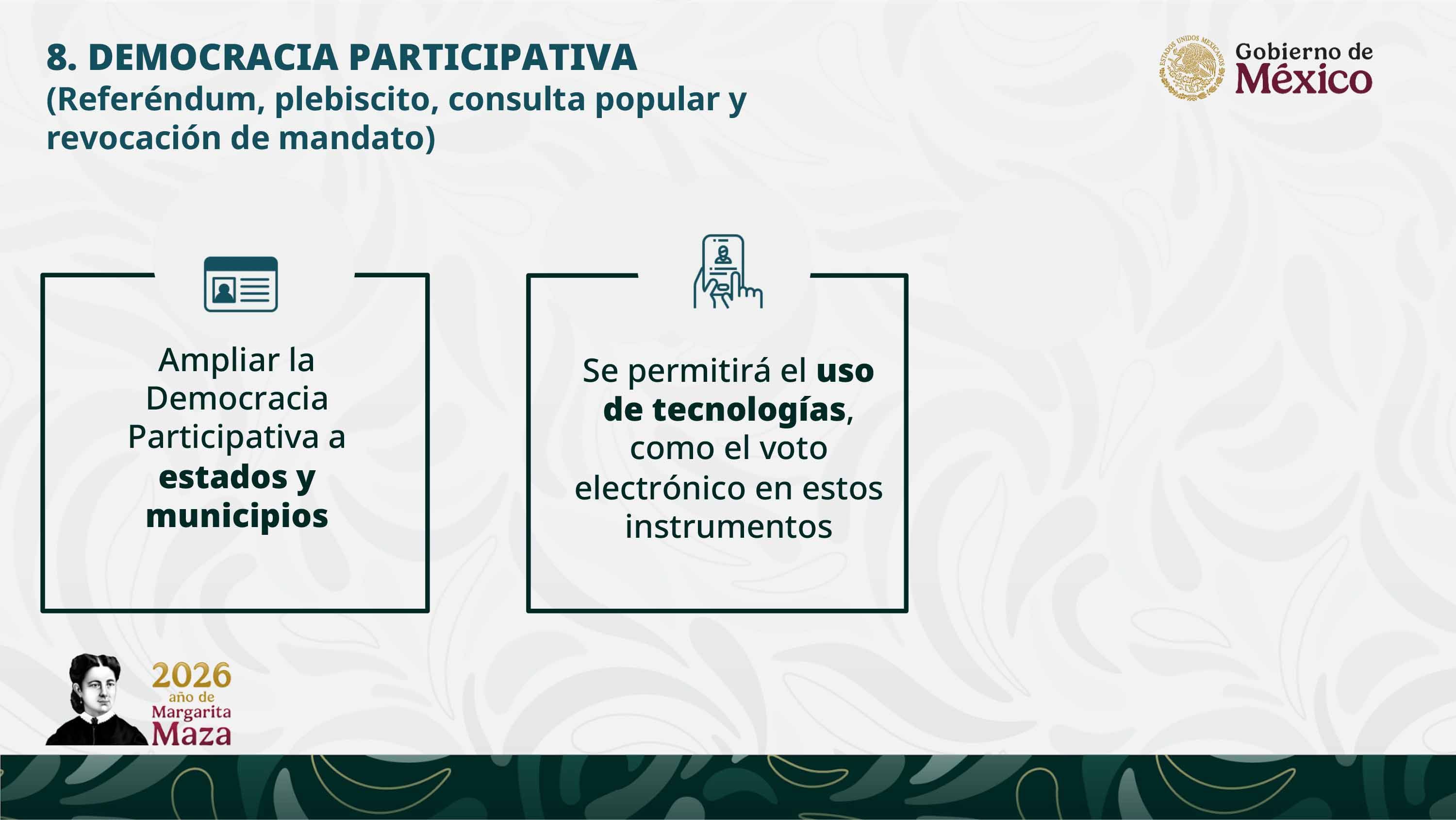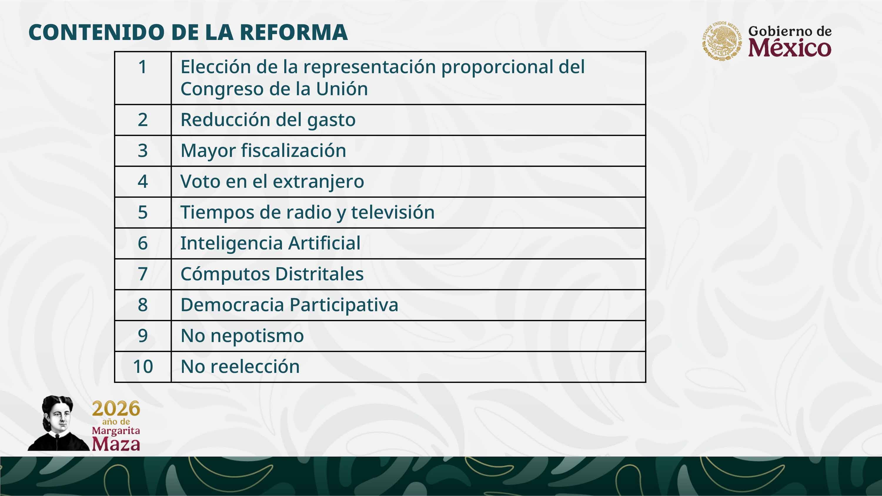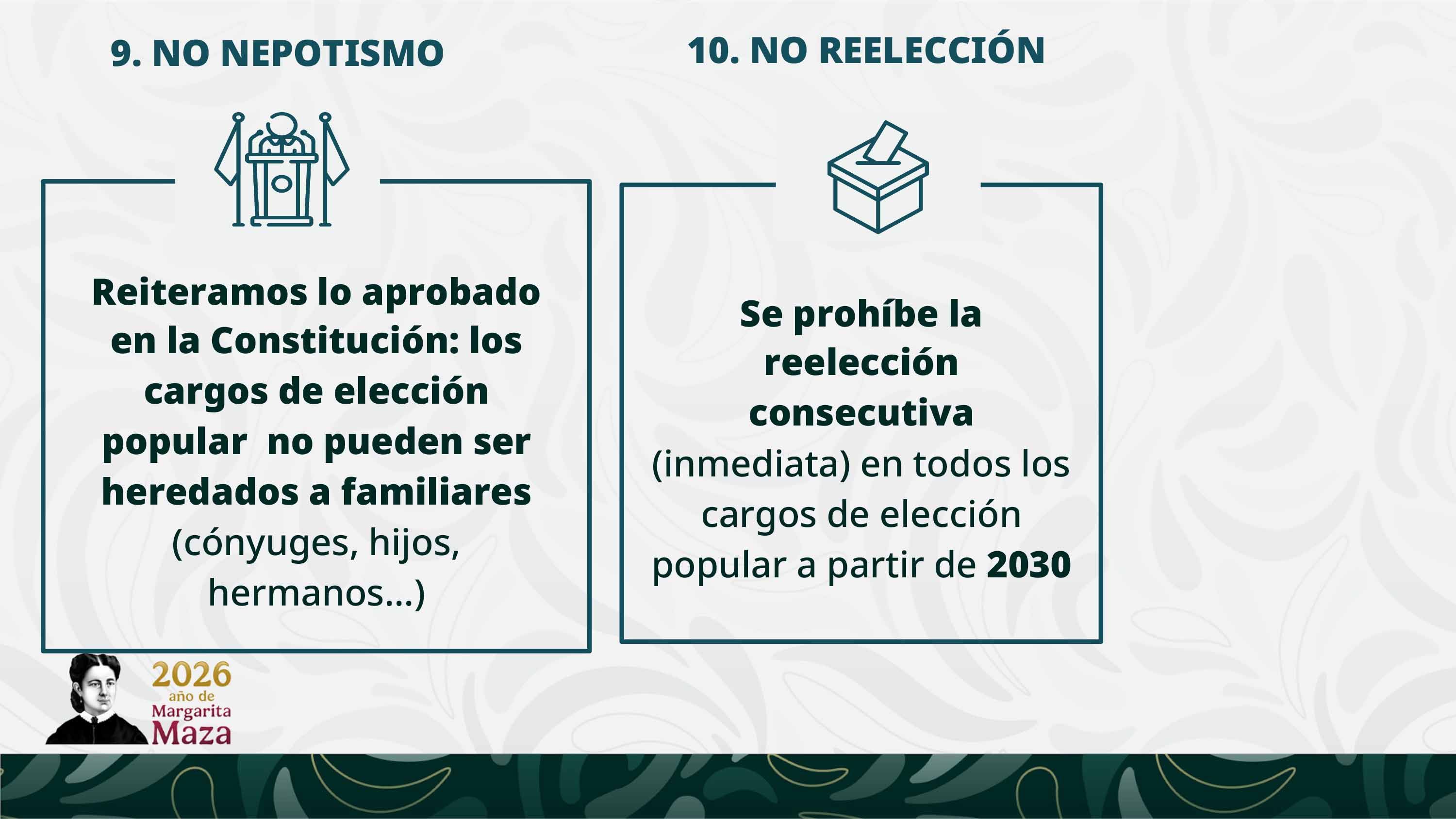 Hoy la presidenta Sheinbaum dio a conocer, en 10 láminas, los contenidos principales de su proyecto de reforma constitucional en materia electoral. Incluyó dos medidas ya aprobadas: derogar la reelección inmediata de legisladores y municipes así como la prohibición de nepotismo electoral, medidas que entrarán en vigor hasta las elecciones de 2030.