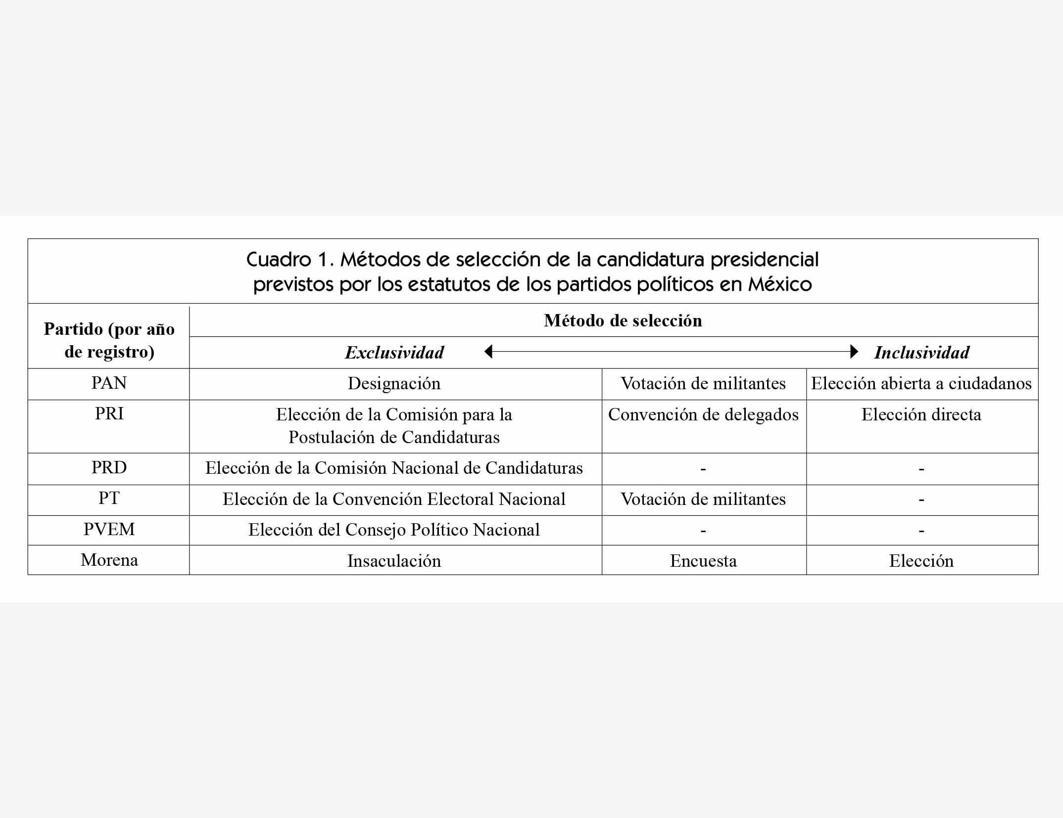 Los mecanismos de selección en períodos de elecciones en México varían entre los partidos, y están detallados en sus estatutos y reglamentos internos. El PAN tiene registrados la selección por votación de militantes, designación y elección abierta a ciudadanos; el PRI asume la elección directa, la designación por Convención de delegados y la designación por la Comisión para la Postulación de Candidaturas; y el PRD utiliza la designación por la Comisión Nacional de Candidaturas. En el caso de los partidos de la coalición “Sigamos Haciendo Historia”, Morena registra los métodos de insaculación, encuesta y elección abierta; el PT prevé en sus estatutos la elección por la Convención Electoral Nacional y la votación abierta a la militancia; y el PVEM estipula la designación realizada por los miembros del Consejo Político Nacional (ver Cuadro 1).