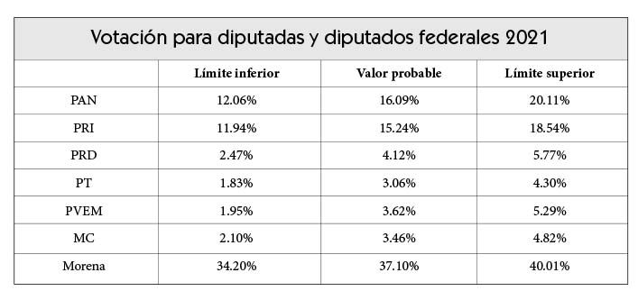 Empecemos por Morena, cuyo rango de votación lo ubica, con sobrada distancia de los demás, como el partido más votado en 2021. El valor más probable de su votación (37.1%) más que duplica la de los partidos en segundo y tercer lugar en intención de voto. Sin lugar a dudas, Morena será, visto su rango de votación, la primera fuerza en la próxima legislatura; pero sin alcanzar, por sí mismo, la condición de partido con mayoría absoluta. Incluso en su valor superior (40%), aún sumados los ocho puntos porcentuales de sobrerrepresentación (lo que no es seguro que ocurra), estaría en un total, grosso modo, de 240 diputados. Seis menos que los obtenidos en 2018.