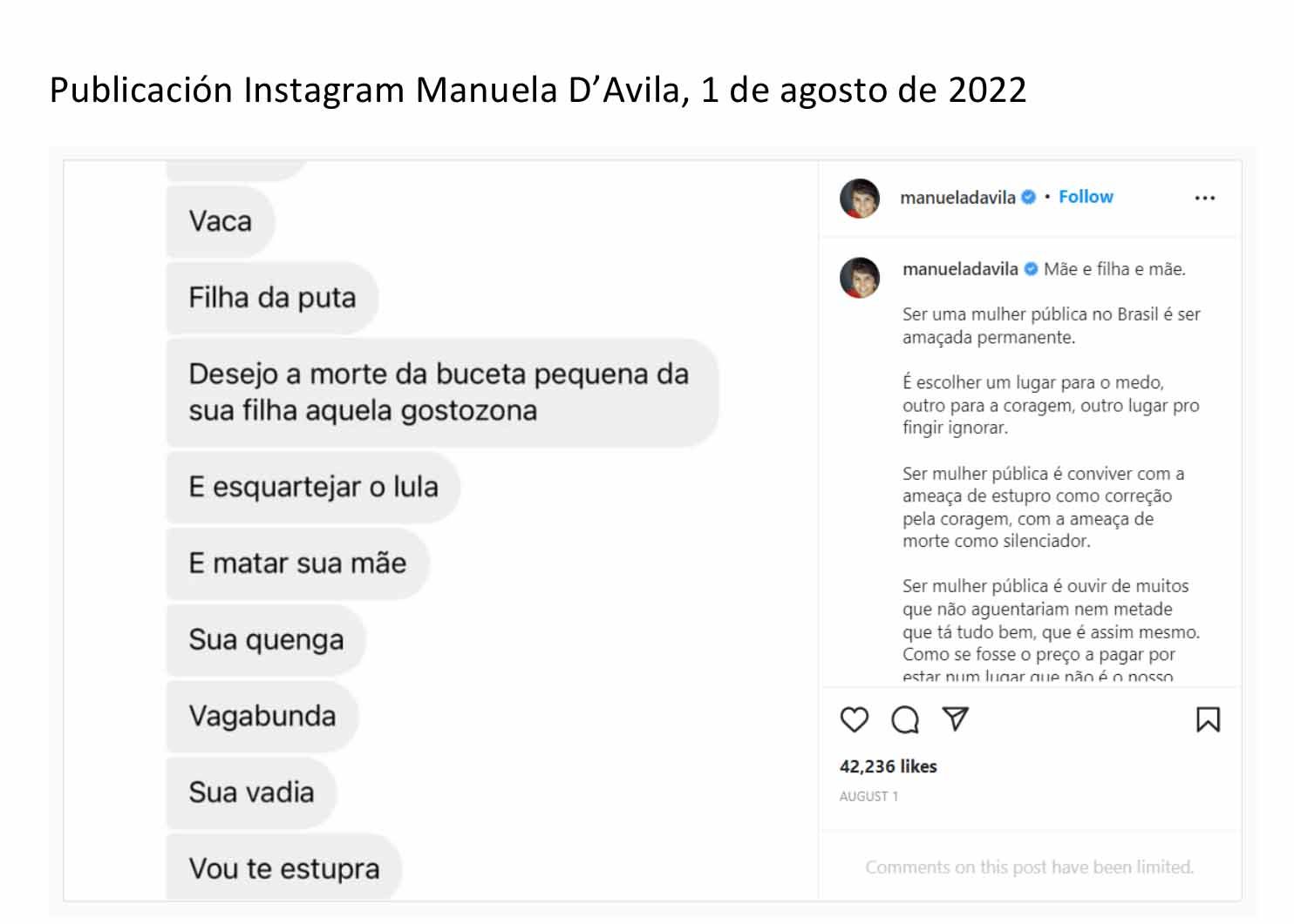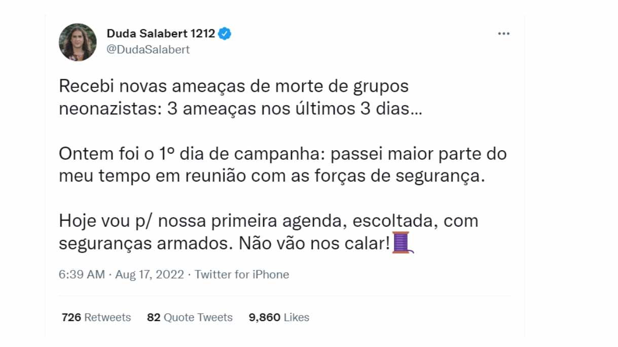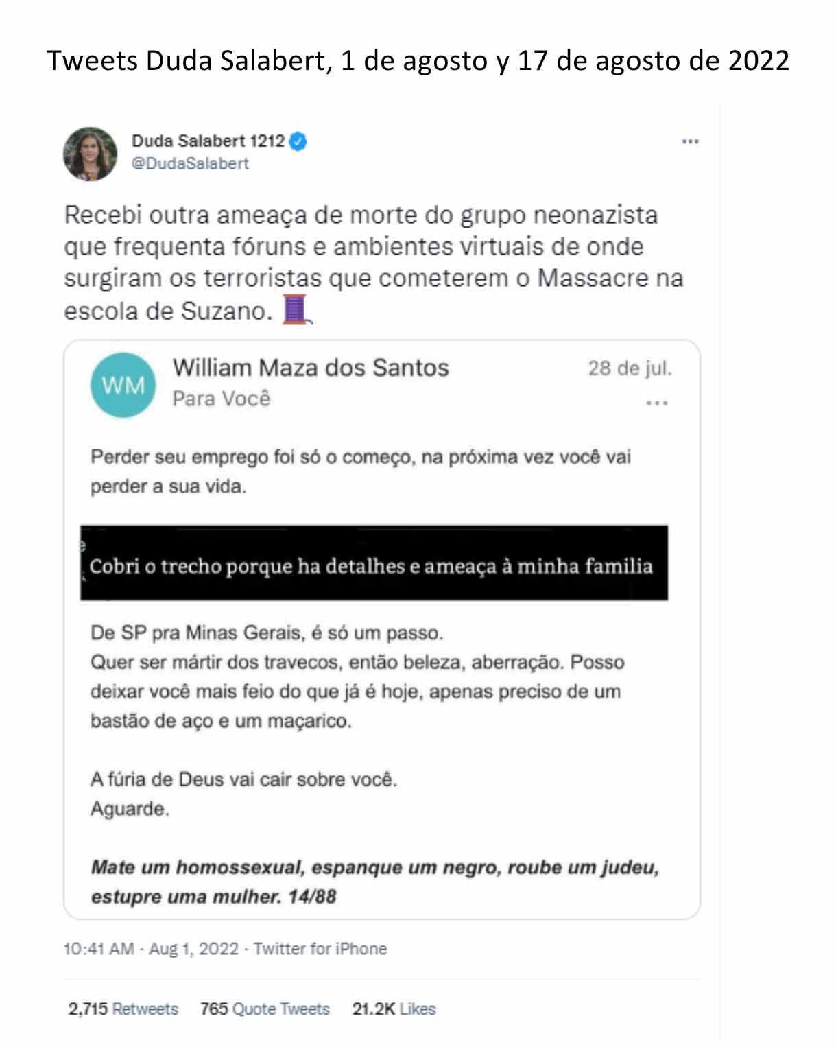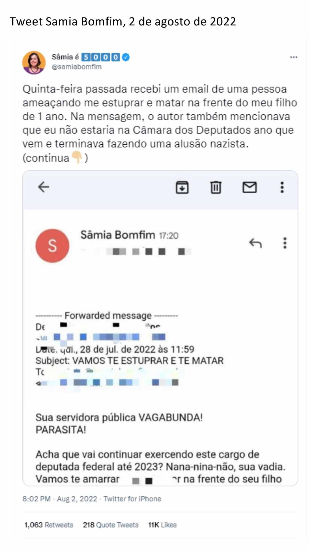 El 2 de agosto del presente año, la feminista Sâmia Bomfim, una de las diputadas federales más votadas en 2018 y candidata a reelegirse por el Partido Socialismo y Libertad (PSOL) en esta elección, denunció en sus redes sociales la recepción de un correo electrónico con amenazas de muerte y violación, así como con alusiones nazistas. Apenas un día antes, la concejala más votada en la historia de Belo Horizonte, Duda Salabert, había hecho una denuncia similar. Salabert, quien es también la primera concejala trans de la capital de Minas Gerais, participa en este proceso electoral como candidata a diputada federal por el Partido Democrático Laborista (PDT). Pero, si bien Salabert ya cuenta con un equipo de seguridad las veinticuatro horas del día provisto por la autoridad municipal, las amenazas no cesan. El pasado 17 de agosto denunció la recepción de tres amenazas más.