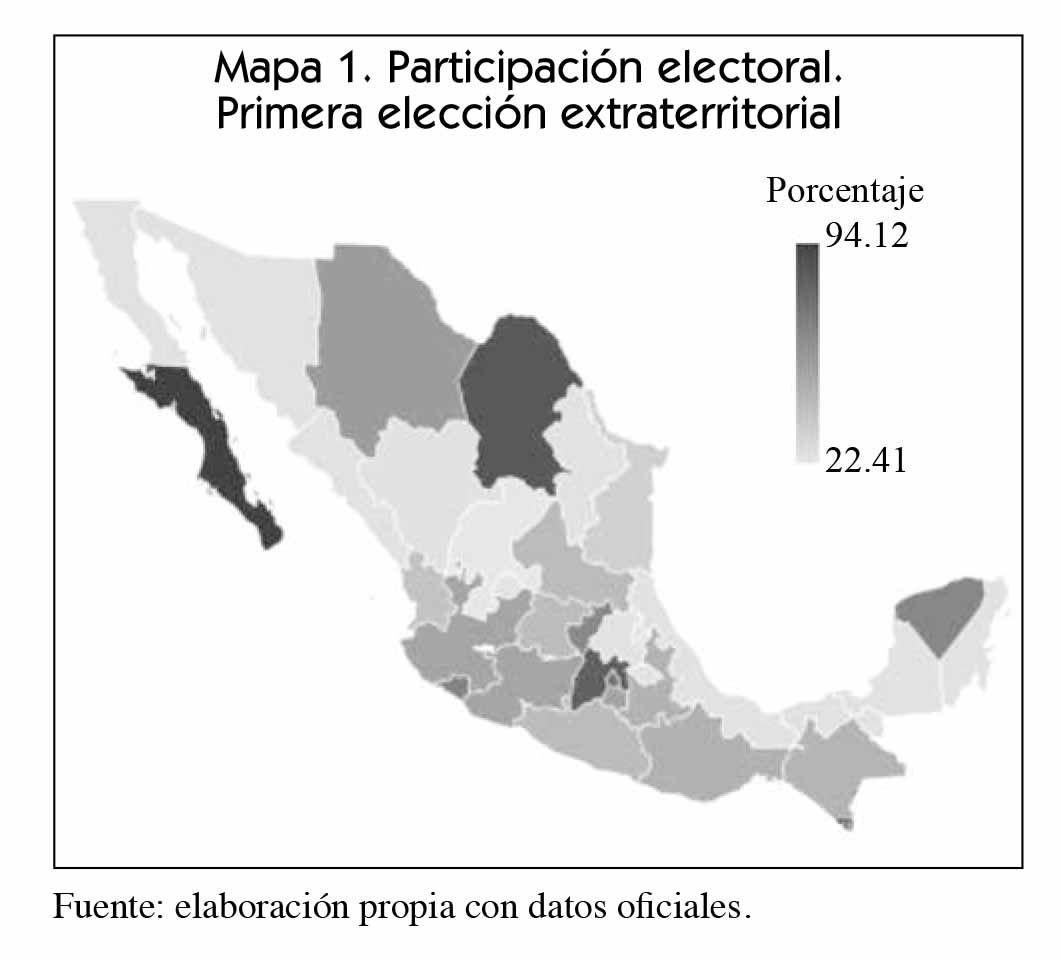 Los números relativos al porcentaje de participación pueden parecer sumamente alentadores en la mayoría de los casos. Para muestra un botón: las primeras experiencias de votación extraterritorial a nivel local en promedio presentan una participación del 52.16%, habiendo ocho entidades por encima del promedio de participación en sus primeros comicios extraterritoriales (ver mapa 1).