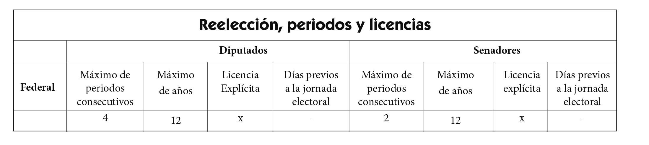 Por lo que toca a las reelecciones de los congresos y su reglamentación en la materia tenemos que hay elección consecutiva en las 32 entidades federativas: en 23 de ellas hasta por 4 ocasiones o 12 años en total y, en las 9 restantes, sólo por dos periodos.