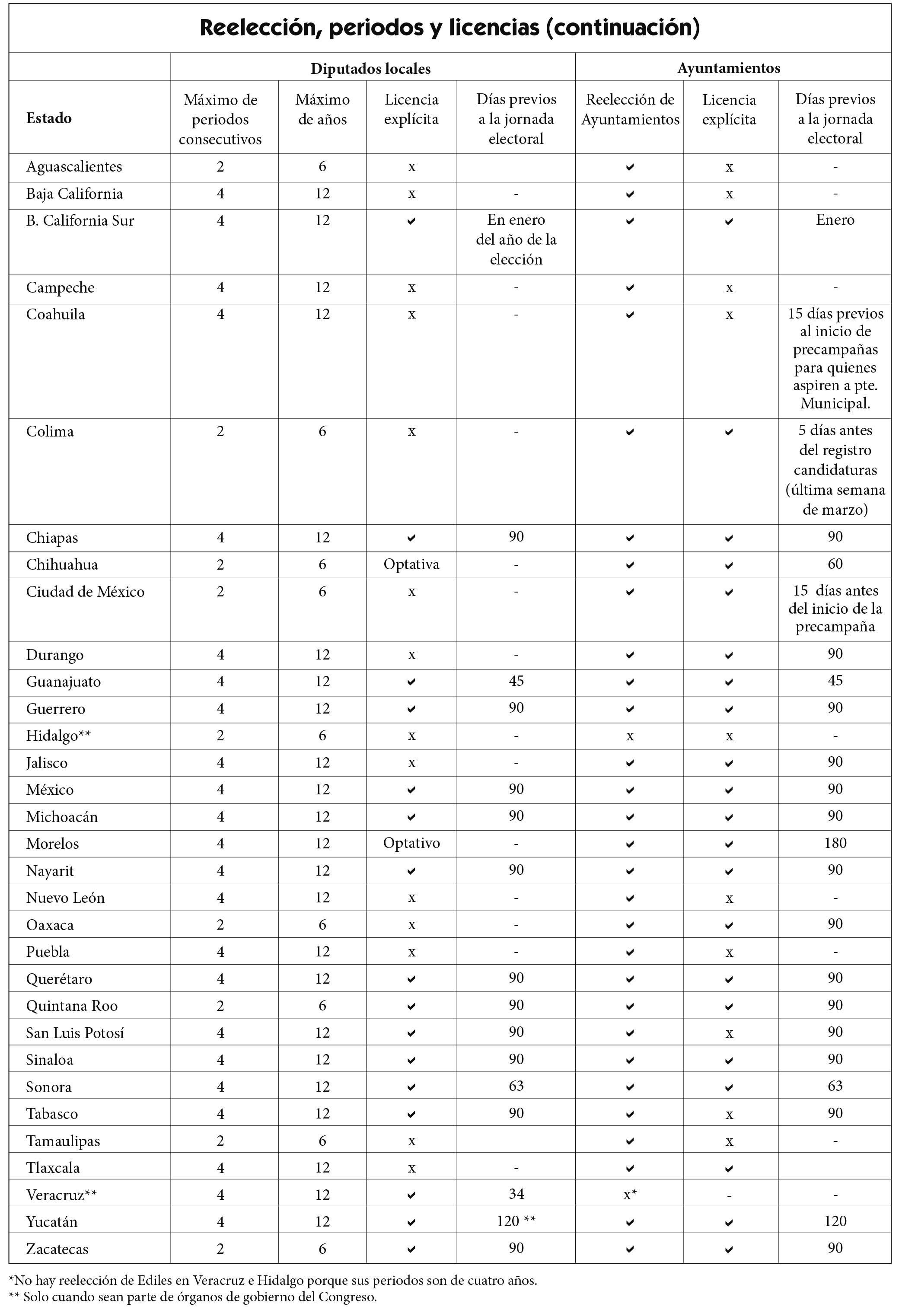 En el caso de los ayuntamientos tenemos que en 30 de las 32 entidades hay reelección o elección consecutivas hasta por un periodo extra; la excepción son los estados de Hidalgo y Veracruz toda vez que –por disposición constitucional– sólo podrá haber reelección cuando los periodos de los cargos sean por tres años. En el caso de estas dos entidades los periodos son de cuatro años.