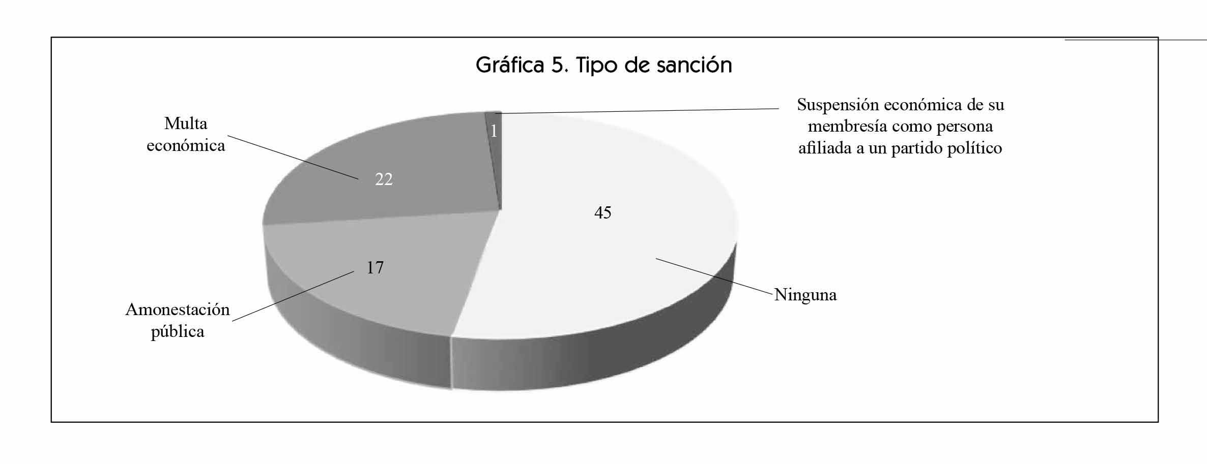 En cuanto a la imposición de sanciones por parte de los diversos órganos resolutivos, cabe mencionar que, en más de la mitad de los casos, es decir, en cuarenta y cinco de los ochenta y cinco casos que se están analizando, no se impone sanción alguna. En los casos en los cuales sí se impuso alguna sanción, se resalta los siguiente: en veintidós casos la sanción fue de naturaleza económica, en diecisiete casos la sanción consistió en una amonestación pública, y en sólo un caso la sanción consistió en la suspensión económica de su membresía como persona afiliada a un partido político (Gráfica 5).