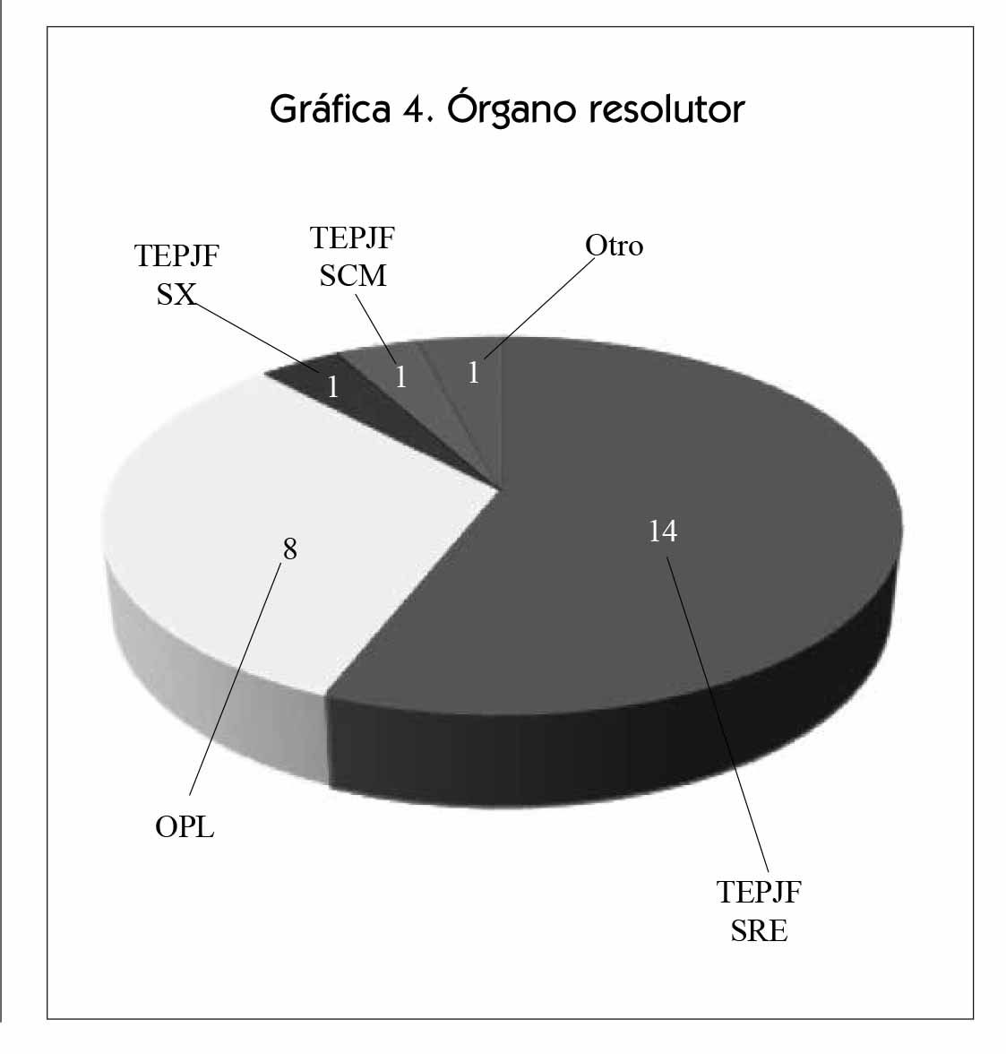 Por otro lado, al cuestionarnos sobre la autoridad encargada de resolver los casos de violencia (Gráfica 4), la mayoría son resueltos por el Tribunal Electoral del Poder Judicial de la Federación con un total de sesenta casos de los aquí analizados (lo cual representa el 71 %), seguido por el Tribunal Electoral del Poder Judicial de la Federación en su Sala Regional Especializada, con la atención a catorce casos (16.5 %). Mientras que, a nivel local, ocho casos fueron resueltos por los Organismos Públicos Locales Electorales (9.5 %), uno fue resuelto por el Tribunal Electoral del Poder Judicial de la Federación en la Sala Regional de Ciudad de México (1 %), así como otro fue resuelto por la Sala Regional de Xalapa (1 %), y otro llevado por la Sala Superior del mismo Tribunal Electoral (1 %).