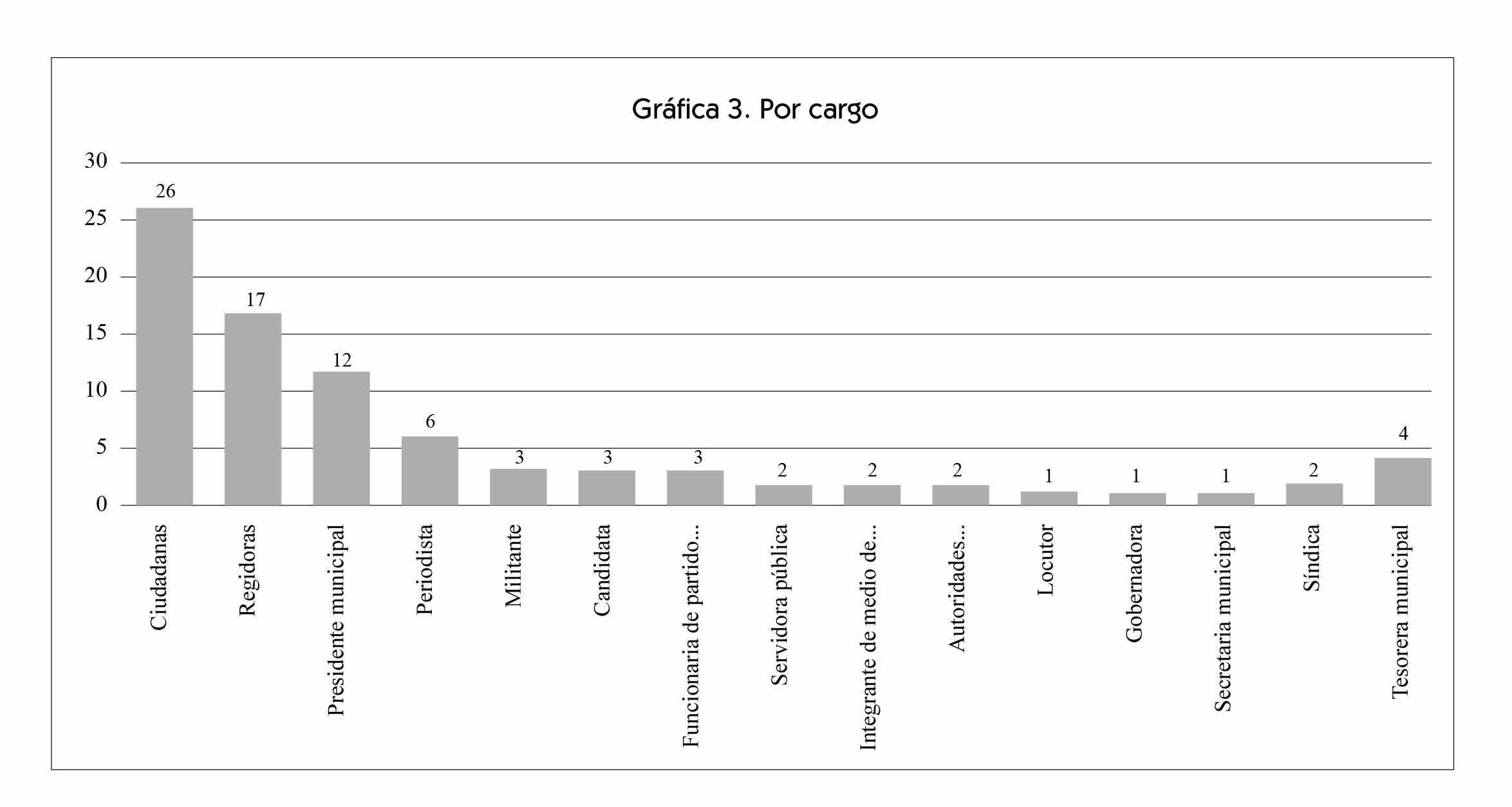 En cuanto a preguntarnos quiénes son los actores que más frecuentemente ejercen este tipo de violencia, es posible establecer, de acuerdo con los datos reflejados en el Registro Nacional, que esta violencia es mayormente ejercida por ciudadanas, representando veintiséis casos (30 % del total), seguido por regidoras en un total de diecisiete casos (20 %), y presidentas municipales en doce casos (14 %). Por otro lado, las figuras que con menor frecuencia se ha registrado violencia política contra mujeres han sido locutoras, gobernadoras y secretarias municipales, con tan solo un caso en cada categoría (Ver Gráfica 3).