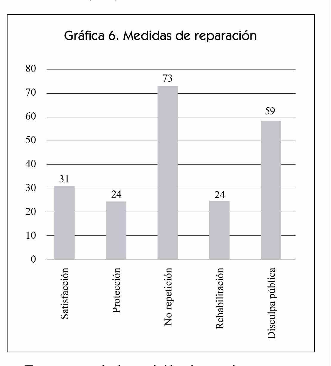En los casos aquí analizados, las medidas más frecuentes fueron: satisfacción en 31 casos, rehabilitación en 24 casos, no repetición en otros 73 casos, protección en 24 casos, y disculpa pública en 59 casos (Gráfica 6).