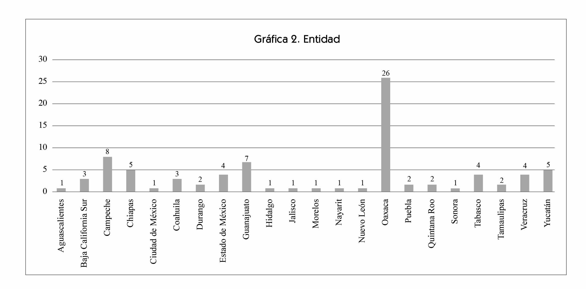 Así, es posible mencionar que, de los ochenta y cinco casos de violencia política cometida por mujeres en contra de mujeres, estos fueron principalmente cometidos en Oaxaca con un total de veintiocho casos (lo cual representa un 31 % del total), seguido por Campeche con ocho casos (es decir, un 9 %). Finalmente, se encuentran Aguascalientes, Ciudad de México, Hidalgo, Jalisco, Morelos, Nayarit, Nuevo León y Sonora, habiéndose presentado en cada una de estas entidades un solo caso. Esto se puede ver mejor explicado en la Gráfica 2.