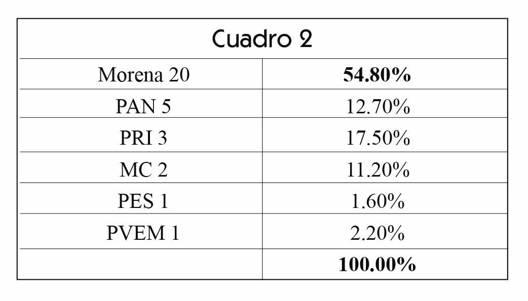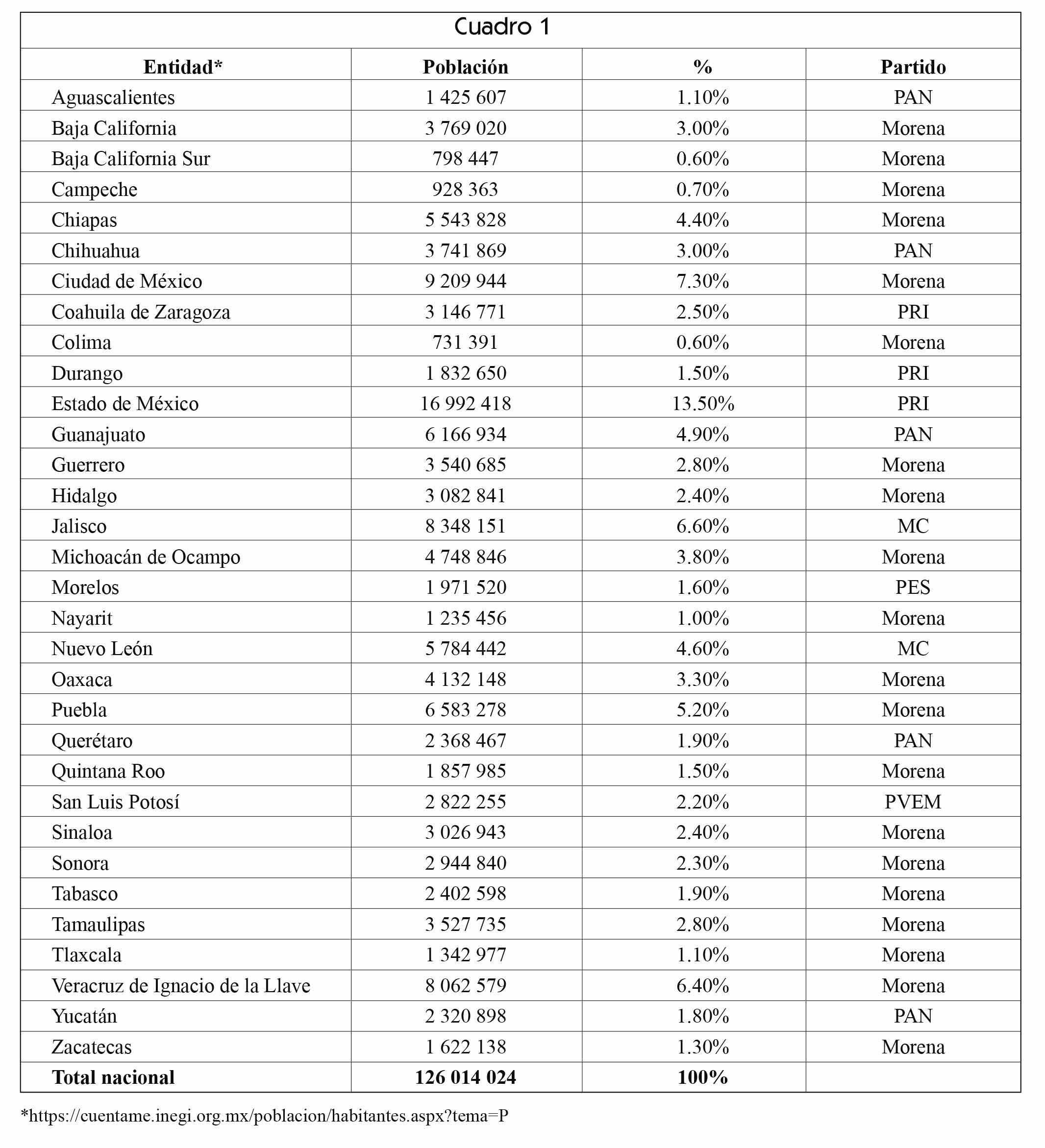 Morena, al parecer, seguirá avanzando en su control al llegar a tener veintiuna de las treinta y dos entidades del país. Actualmente, con veinte entidades, gobierna al 54.8 por ciento de la población –por lo que hace a gubernaturas. Si a esto se suma el estado de México se llegaría a gobernar en lo local al 68.3 por ciento de la población. Siete de cada diez mexicanos. Nada mal ganar una de las dos entidades en disputa gubernamental para el primer domingo del junio venidero.