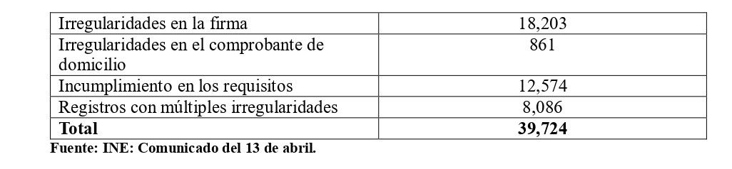 El mismo 13 de abril, el INE emitió un comunicado[1] para informar que se había realizado una revisión minuciosa de 42 mil 436 solicitudes. De las cuales, se determinó la improcedencia de 39 mil 724. Las inconsistencias detectadas fueron las siguientes: