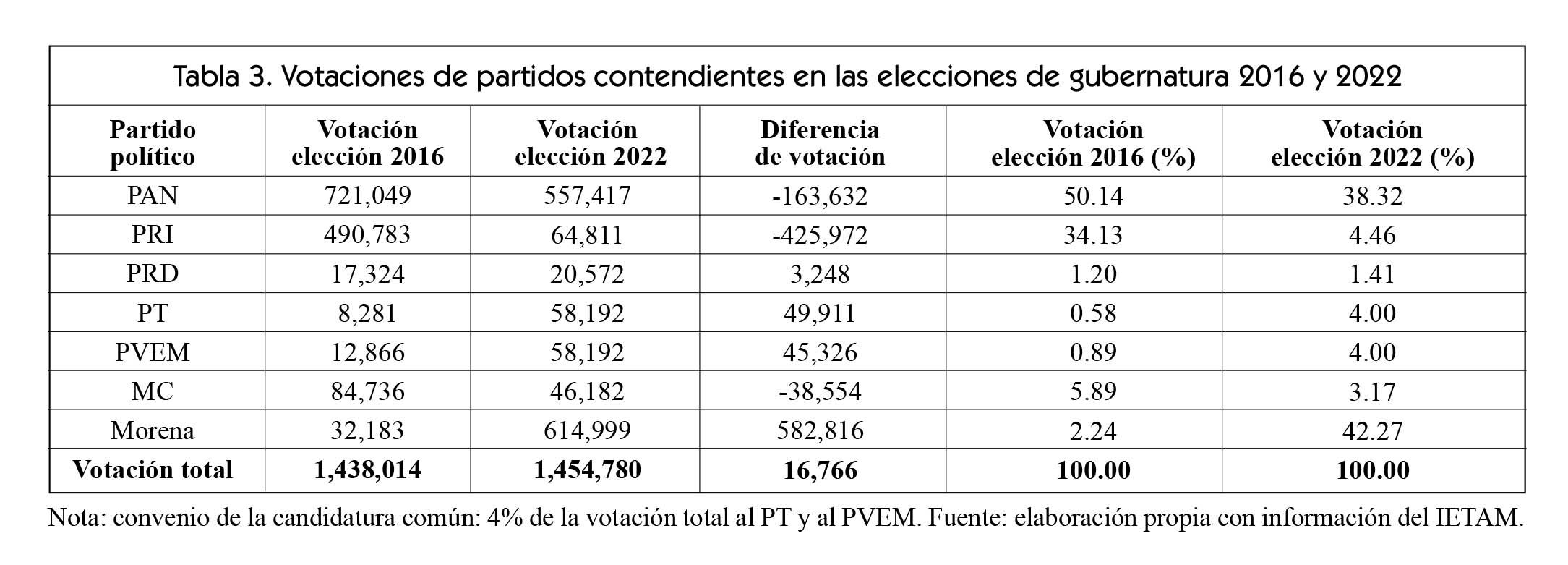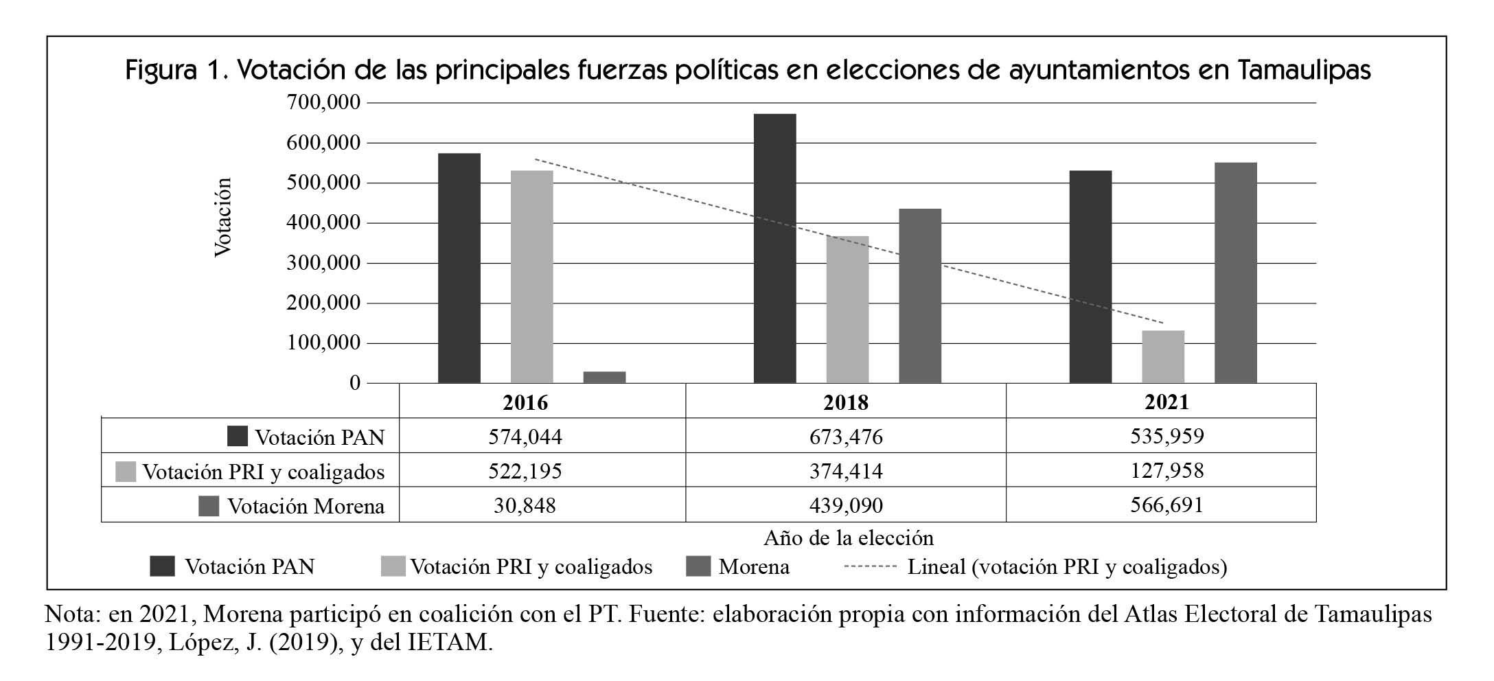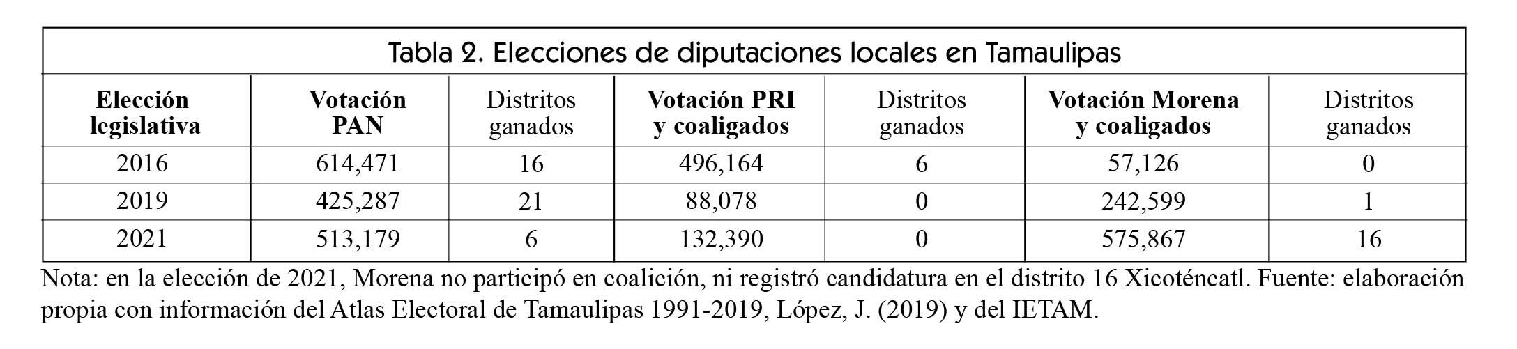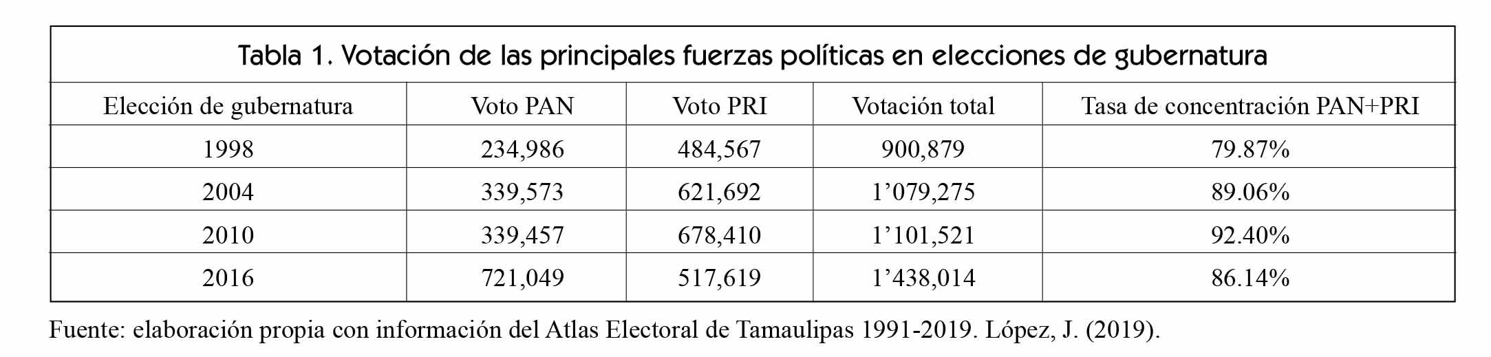 De 1998 al 2016, el escenario político de Tamaulipas estuvo marcado por el bipartidismo PRI-PAN. La primera alternancia tuvo lugar en 2016 con el triunfo del actual gobernador de extracción panista. Sin embargo, el PAN y el PRI mantuvieron su predominio en el sistema de partidos local (Tabla 1).