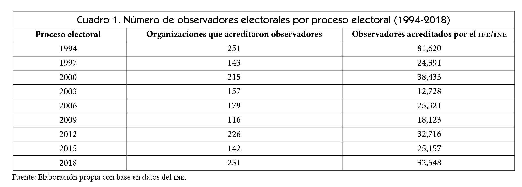 1 Con información obtenida del documento interno de la Coordinación de Asuntos Internacionales del Instituto Nacional Electoral (ine), Observadores Electorales: Integración y Funcionamiento Nacional e Internacional, 1993.