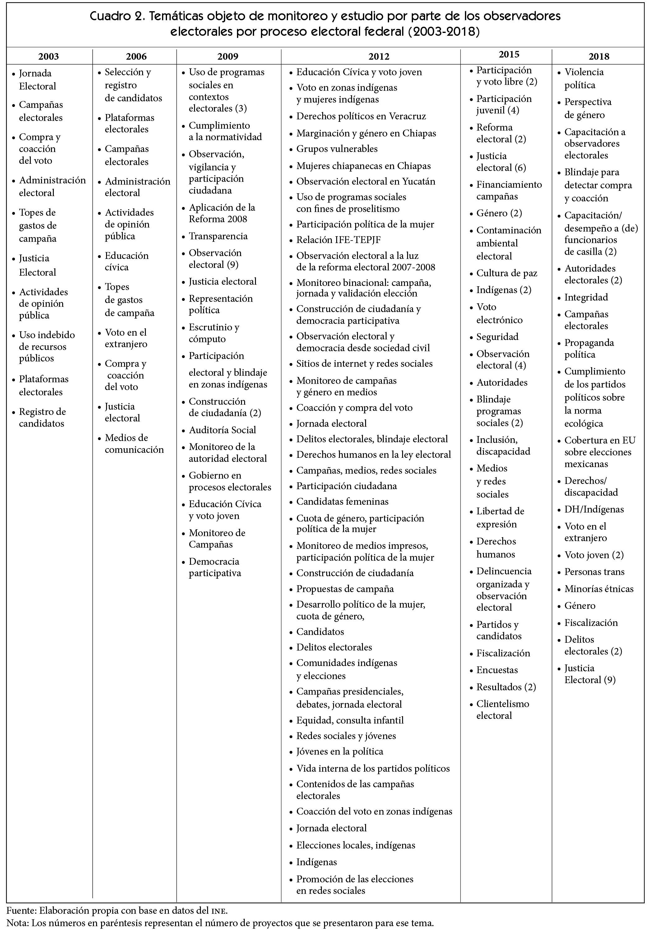 Las premisas sobre las cuales descansó la observación electoral en este proceso no solamente fueron los temas relacionados con la organización de elecciones libres y limpias, sino que se comenzaron a desarrollar actividades de observación en etapas previas a la jornada electoral, destacando significativamente el acceso a los medios de comunicación, el periodo de campañas electorales, el voto de los mexicanos en el extranjero, los conteos rápidos y el programa de resultados electorales preliminares (prep). El entusiasmo cívico por la observación electoral se fue transformando dados los trabajos orientados a la acreditación de las instituciones y los procedimientos electorales llevados a cabo por el ife. Muchos de los observadores confiaban en la institución y dejaron de realizar actividades de observación en su enfoque ortodoxo. Los observadores que continuaron realizando observación electoral fueron especializándose en otros ejes temáticos (ver Cuadro 2).