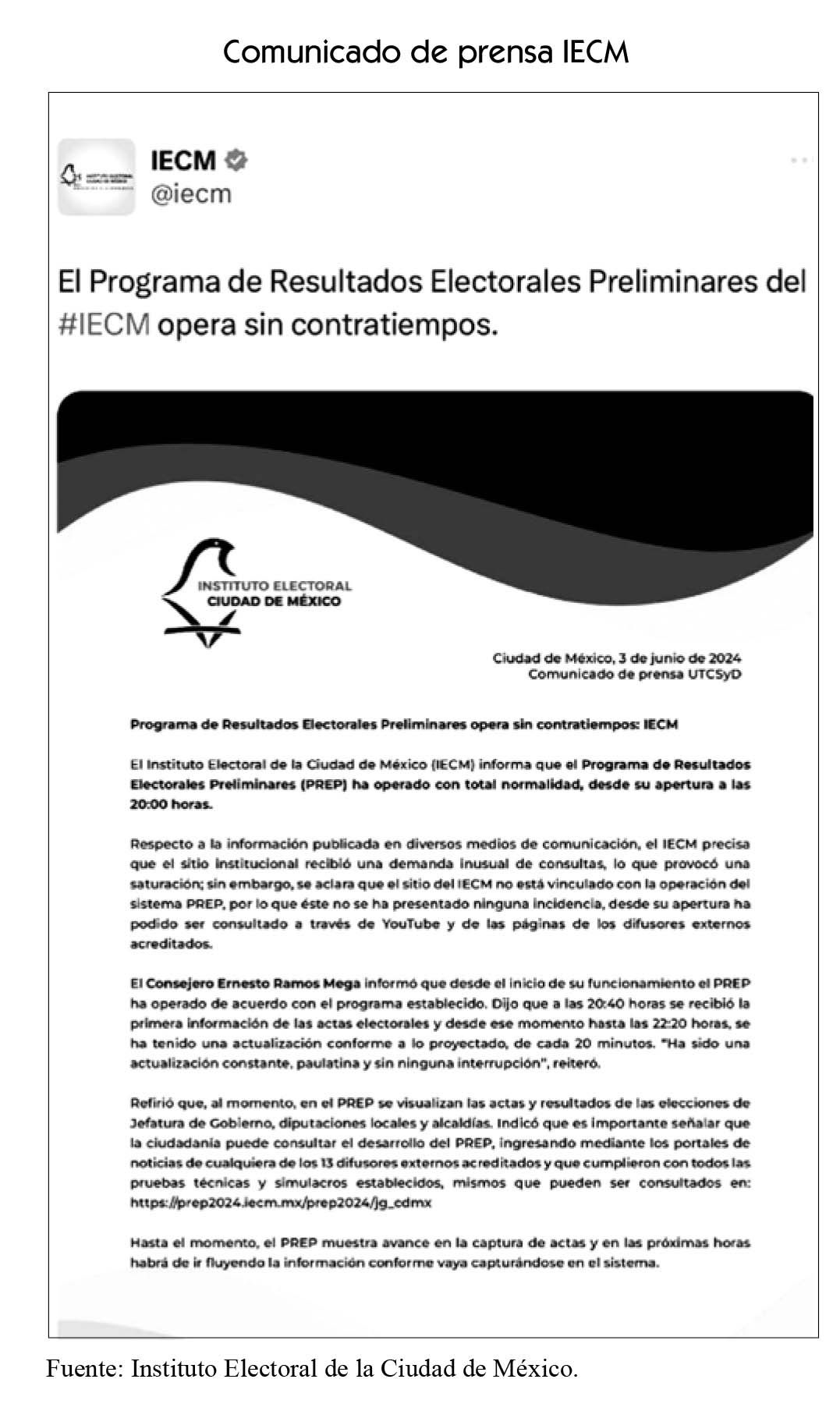 Ante la proliferación de noticias falsas y manipulación de la información la misma noche de la jornada electoral, relacionadas con la seguridad del PREP y “presuntos ciberataques”, en sesión pública del Consejo General del IECM se aclaró extensivamente que el PREP no había sido vulnerado y funcionaba sin ningún tipo de intermitencia. También se hizo énfasis en que la página institucional del IECM, con un peso de un terabyte, recibió una demanda inusual de consultas, aparentemente de personas que deseaban acceder al PREP a través de la página oficial, misma que no contenía la información preliminar de las elecciones. Por ello fue por lo que se decidió dar de baja temporalmente la página institucional, de manera que al retirar este elemento intermediario entre la ciudadanía y el PREP, este podía recibir consultas directamente sin impedimentos. Precisamente eso fue lo que sucedió y el PREP recibió millones de consultas sin inconvenientes ni intermitencias.