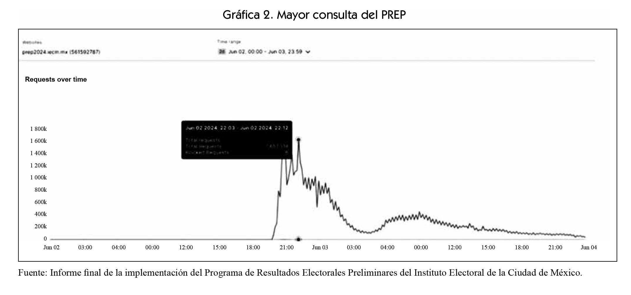 Como se puede observar en la gráfica anterior, el punto de mayor consulta del sitio de publicación del PREP se registró de las 22:03 a las 22:12 horas del 2 de junio de 2024, teniendo un total de 1 657 318 consultas en ese breve periodo de tiempo. Ante tal demanda de información, el PREP mantuvo un funcionamiento eficiente. La captura de actas de escrutinio y cómputo rebasó el 99% en las tres elecciones.