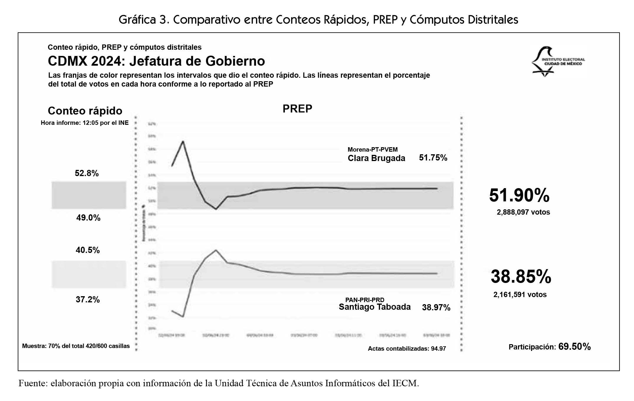 Por ejemplo; para la elección de Jefatura de Gobierno, los resultados de los conteos rápidos arrojaron una diferencia porcentual del 12.3 % entre la primera y la segunda fuerza política. El PREP, por su parte, refleja una diferencia del 12.78 %, mientras que los cómputos distritales, finalmente, marcaron una diferencia del 13.05 %, como se observa en la Gráfica 3.