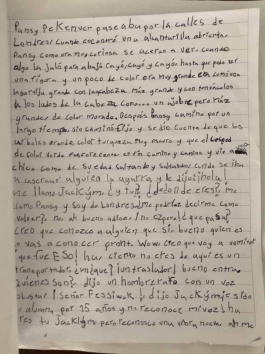 Pansy Pekenver paseaba por las calles de Londres cuando encontró una alcantarilla abierta. Pansy, como era muy curiosa, se acercó a ver. Cuando algo la jaló hacia abajo, cayó, cayó y cayó… hasta llegar a un bosque donde pudo ver una figura de color. Era muy grande, como una lagartija con una gran cabeza con tentáculos a los lados, como un ajolote pero mucho más grande, de color morado. Después, Pansy caminó por un largo tiempo sin rumbo fijo y se dio cuenta de que los árboles eran de color turquesa muy obscuro y el césped de color verde fosforescente; en fin, caminó y caminó hasta a encontrar a una chica como de su edad saltando y saltando.