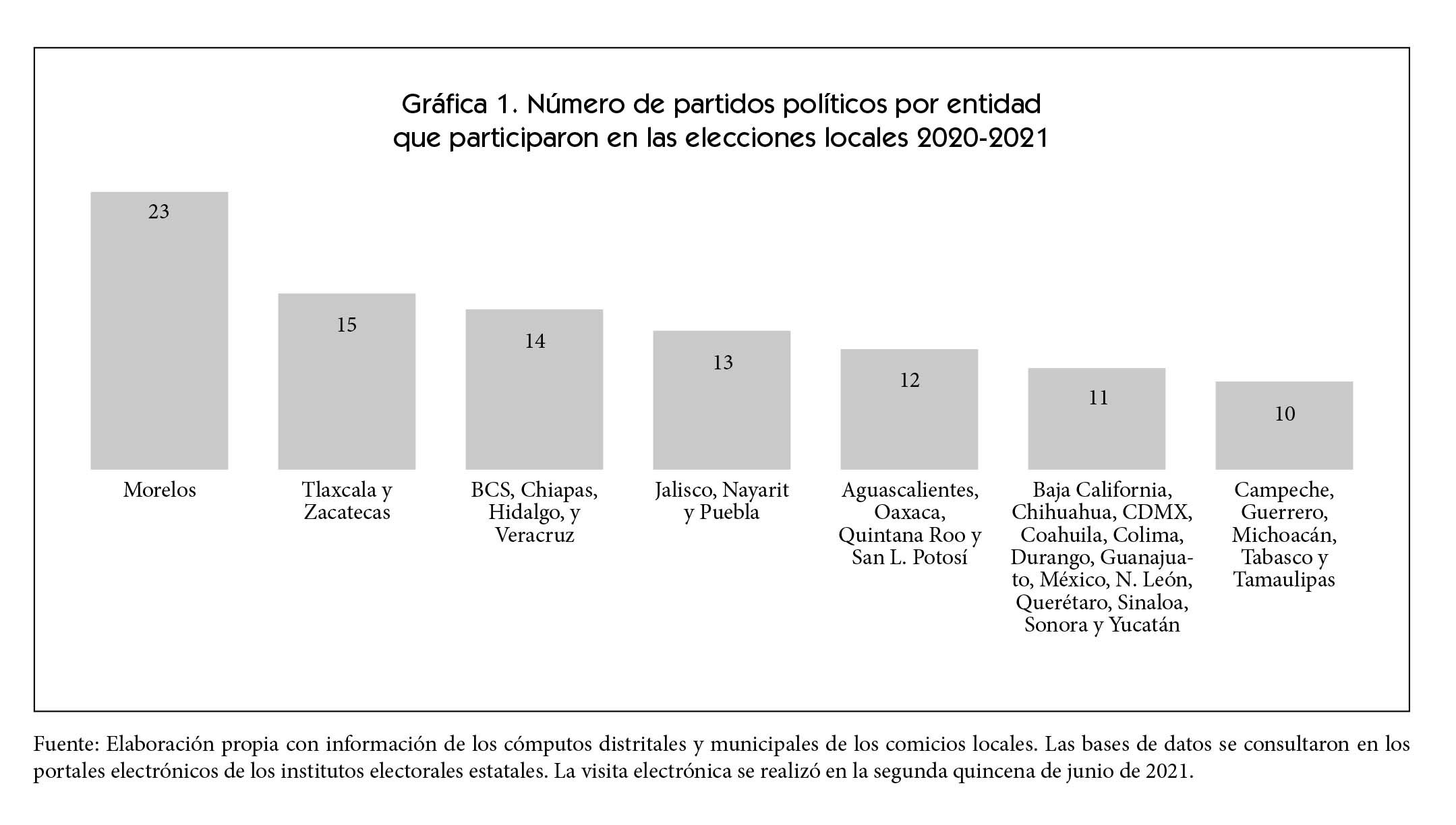 En la gráfica 1 se puede observar que, a excepción de Morelos, cuyo sistema de partidos es el más fragmentado del país, las entidades cuentan más o menos con el mismo número de organizaciones partidistas.