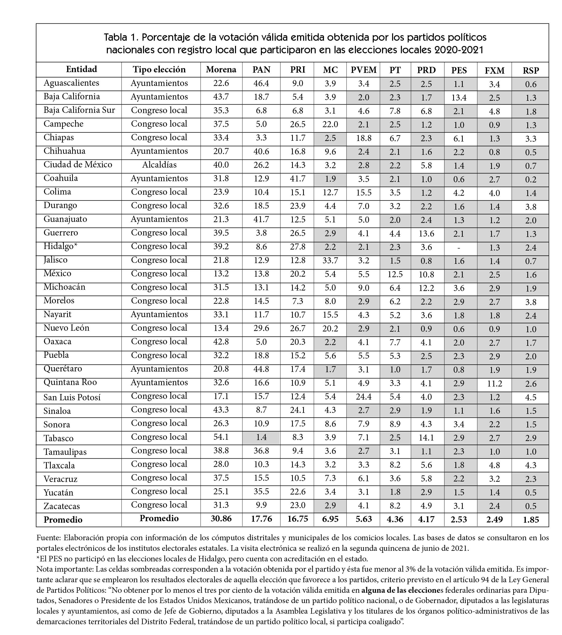 2 El presente estudio utiliza los resultados de los cómputos distritales y municipales de los procesos electorales locales 2020-2021; sin embargo, en varios estados, el proceso electoral no ha concluido por estar impugnados los resultados. Después de que los tribunales electorales resuelvan esas impugnaciones, es posible que se modifiquen los resultados electorales y con ello se salven algunos partidos de perder el registro. El documento fue concluido en la primera semana de julio de 2021.