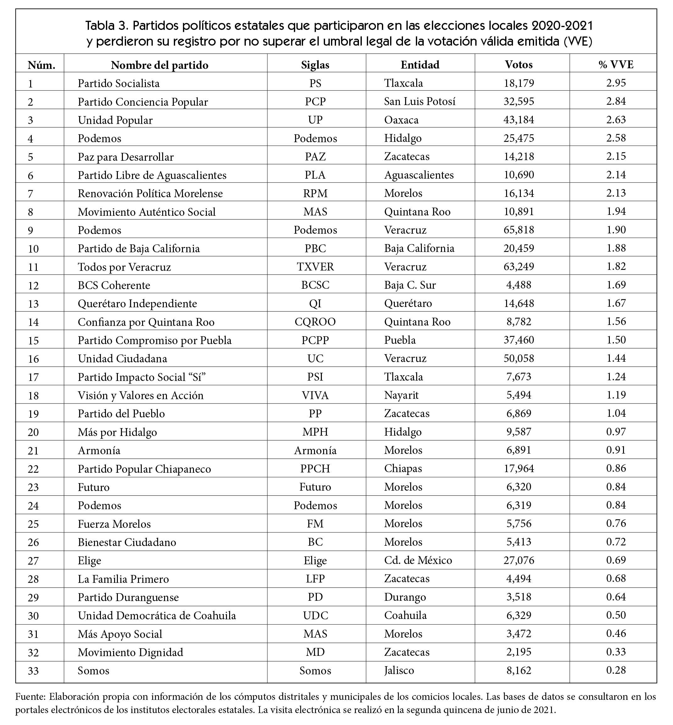 De los cuarenta y cuatro partidos locales que participaron en las elecciones estatales de 2021, treinta y tres perdieron su registro (ver tabla 3). Esto significa que el 75% de estos partidos desaparece y deja de participar en las próximas elecciones.
