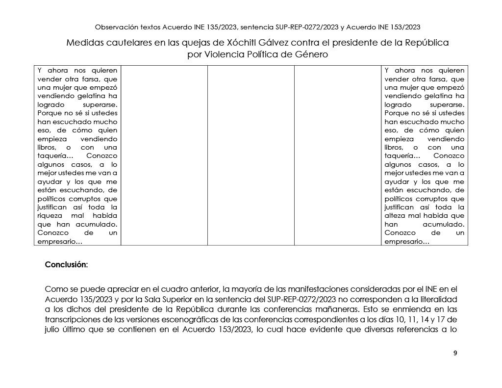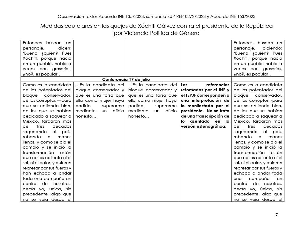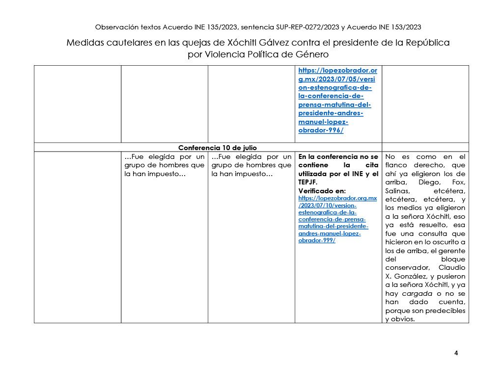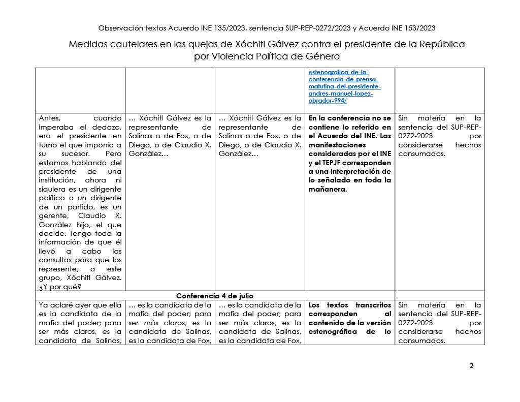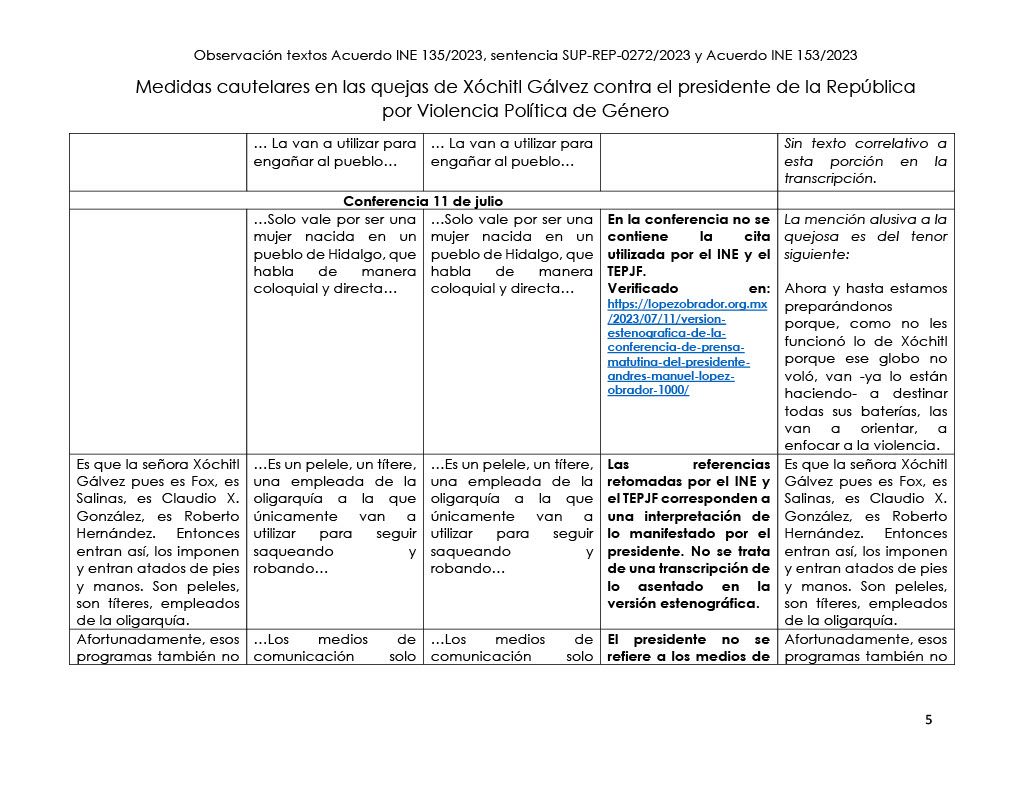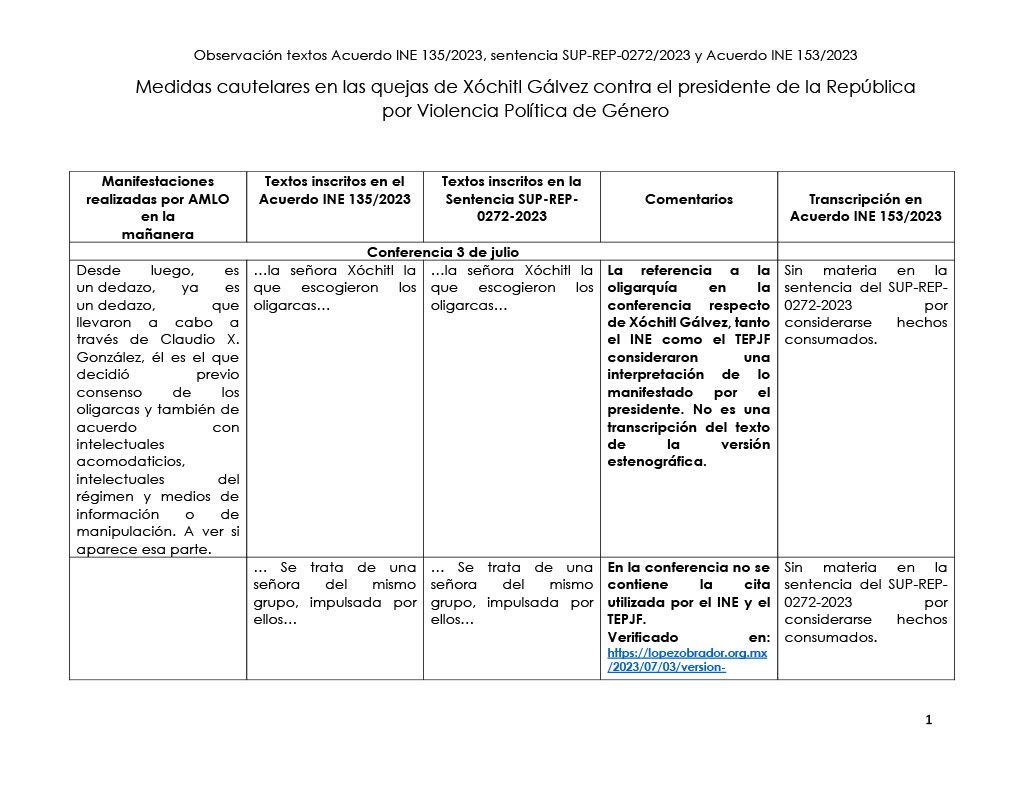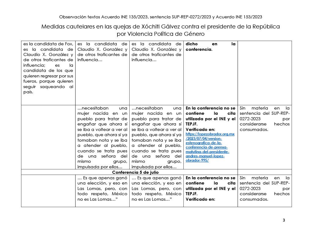 (i) El Acuerdos ACQyD-131/2023 del 13 de julio de 2023 y ACQyD-135/2023 del 20 de julio de 2023; (ii) La Resolución del recurso de revisión del procedimiento especial sancionador SUP-REP-272/2023, y (iii) Las partes relativas a las quejas presentadas de las versiones estenográficas de las conferencias de prensa matutinas del presidente de la República de los días 3, 4, 5, 10, 11, 14 y 17 de julio de 2023.