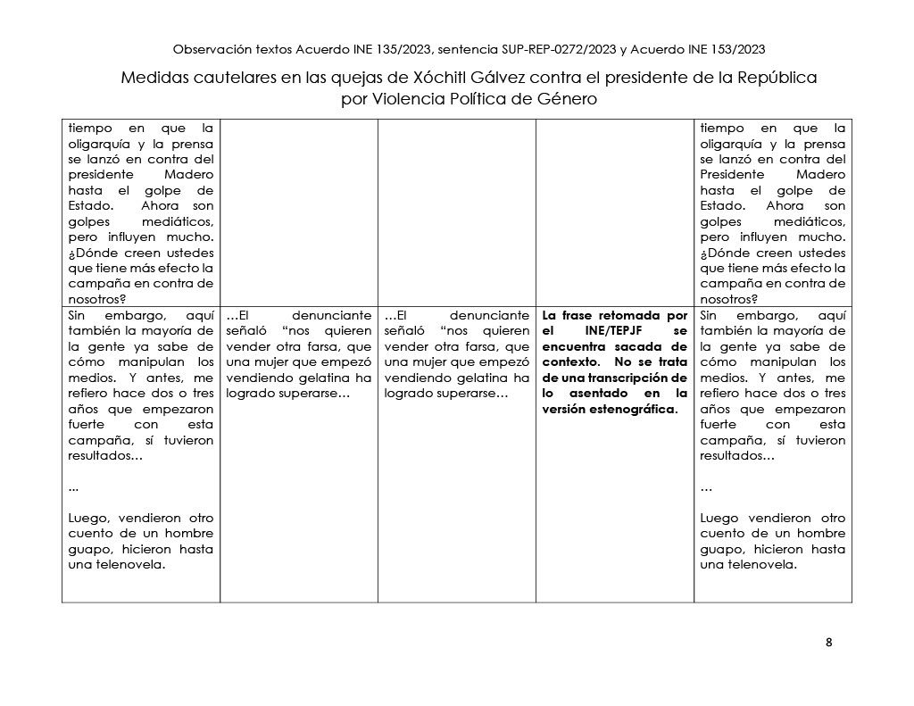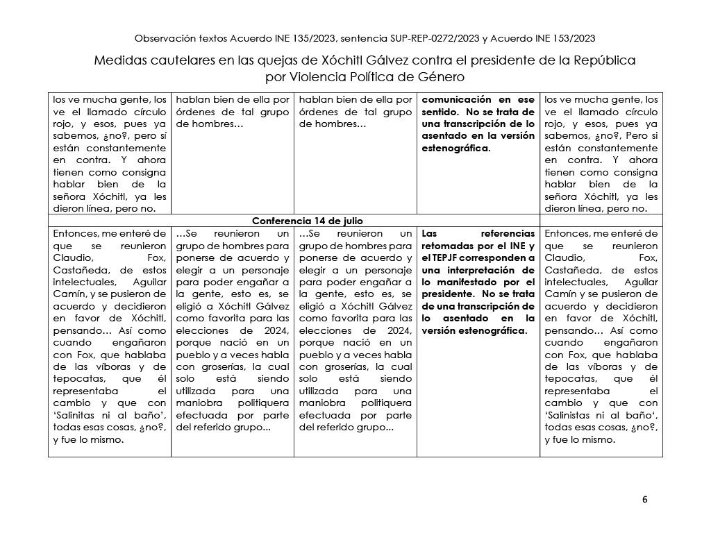 Por otro lado, la secuencia de las medidas cautelares solicitadas por presuntas expresiones de violencia política en contra de las mujeres por razón de género requiere el cotejo entre los textos contenidos en las versiones estenográficas de las conferencias “mañaneras” y su recepción en los proyectos de Acuerdos de la Comisión y de sentencia de la Sala Superior, y que a la postre se aprobaron.